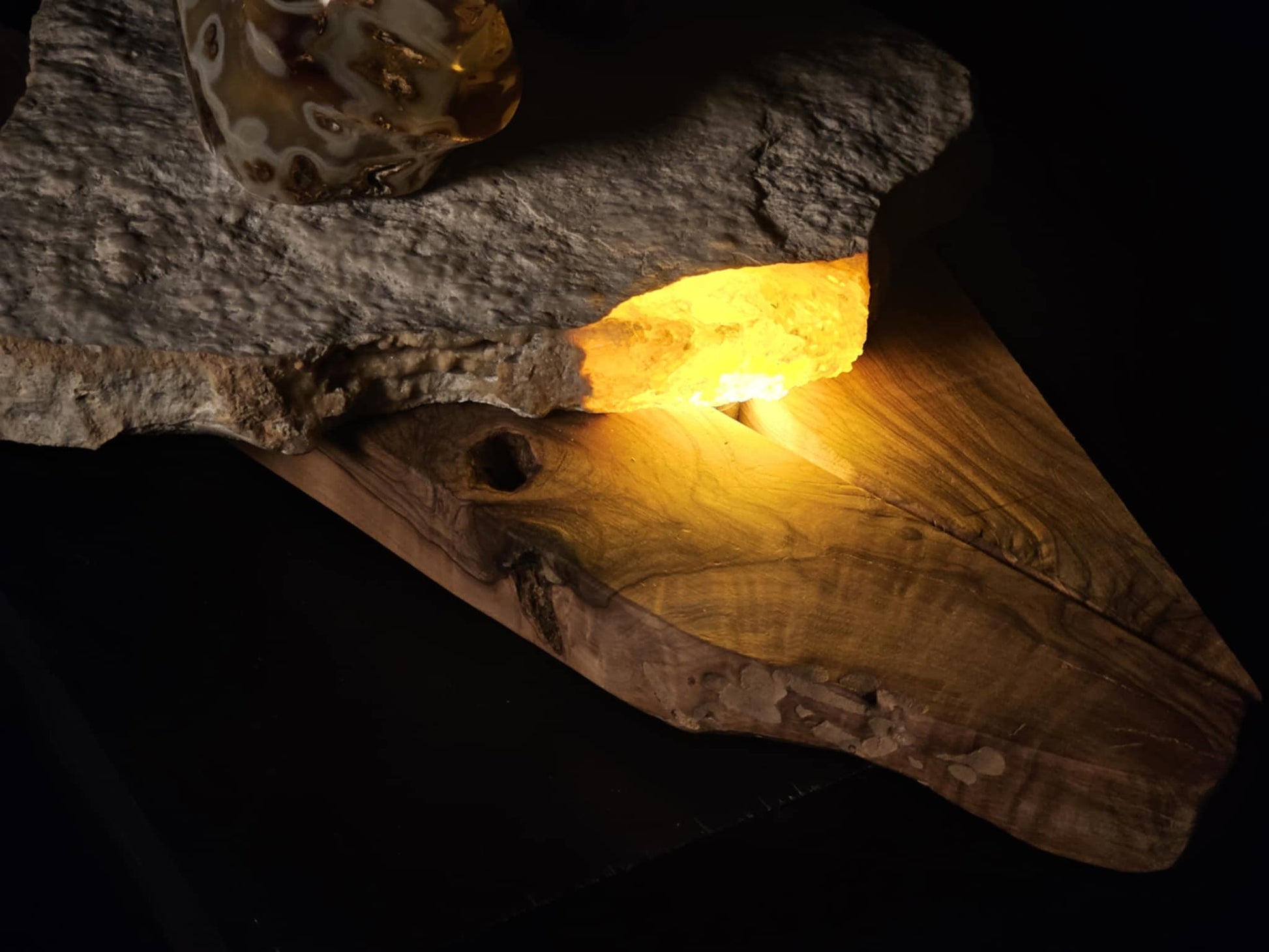 Realizzata con materiali della terra pugliese – ulivo millenario, pietra della Murgia e una potente agata – questa scultura è una guida silenziosa, un faro interiore che si accende proprio nei momenti più oscuri.