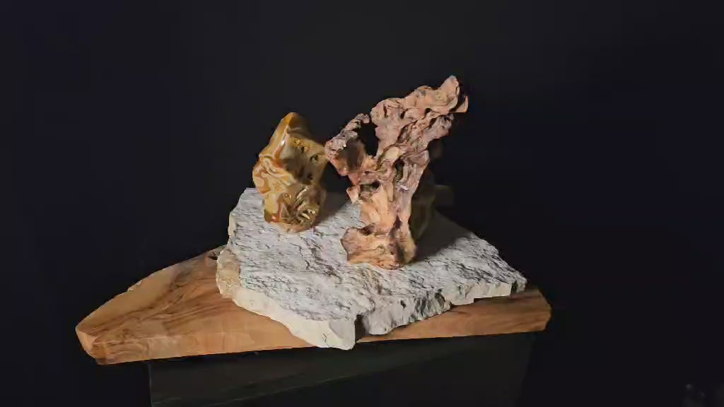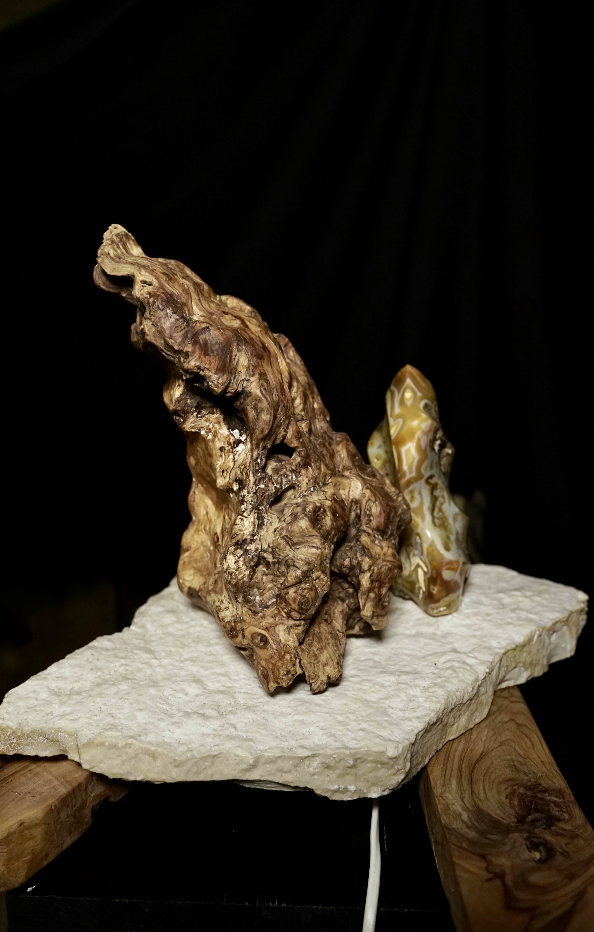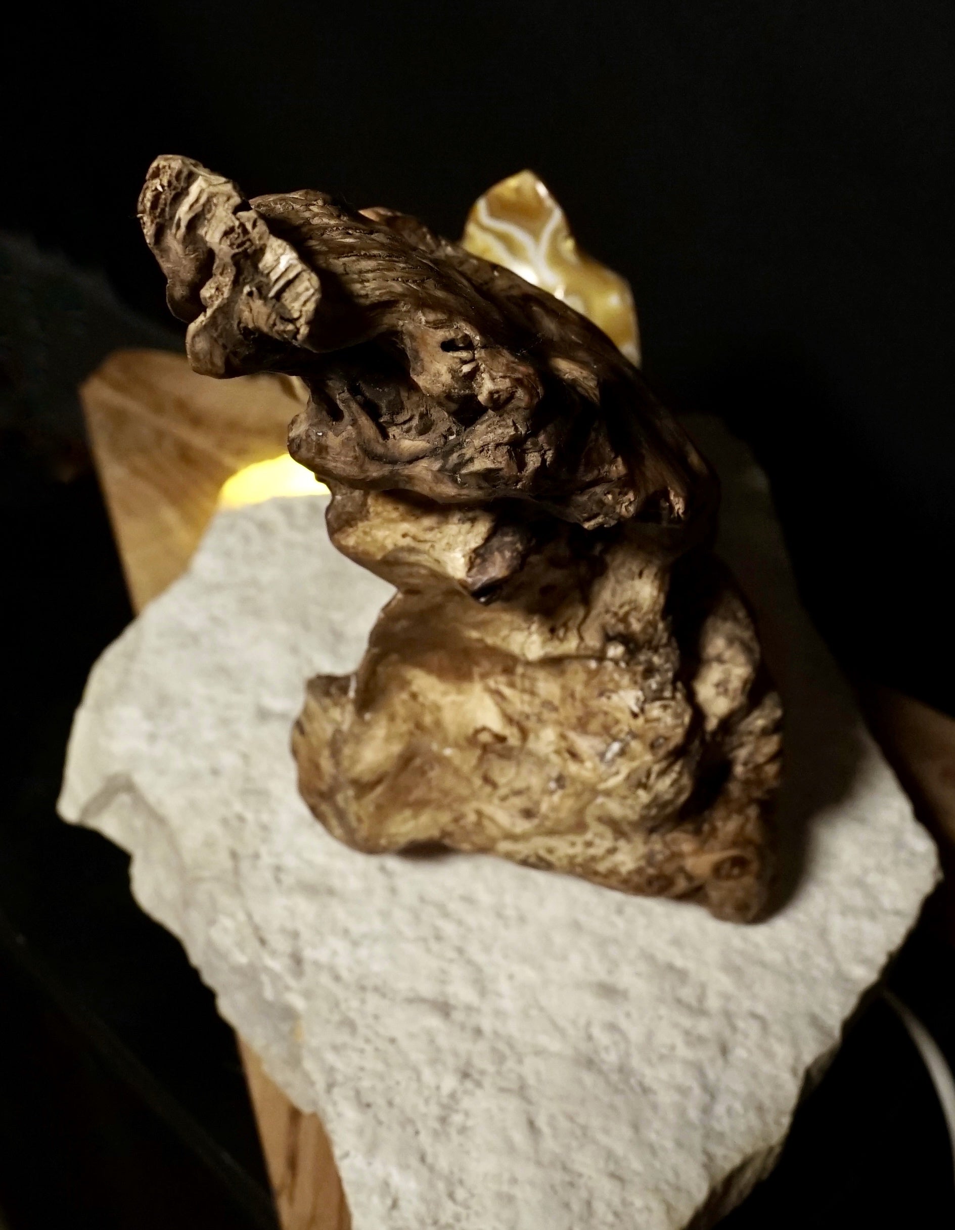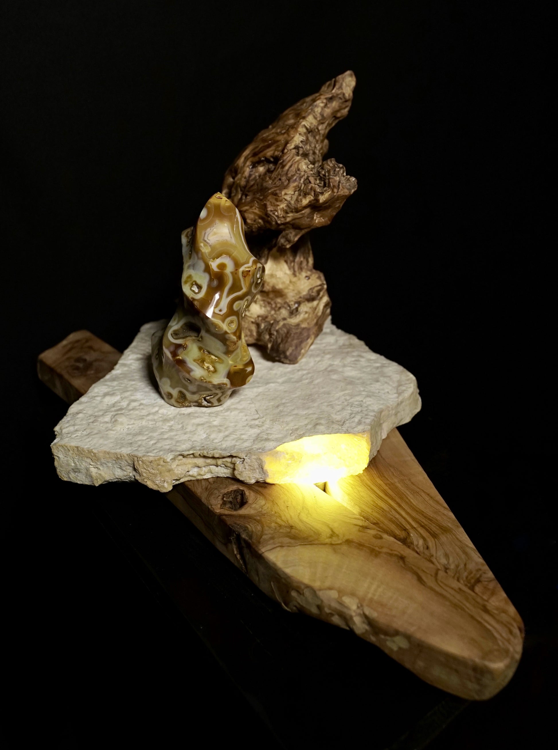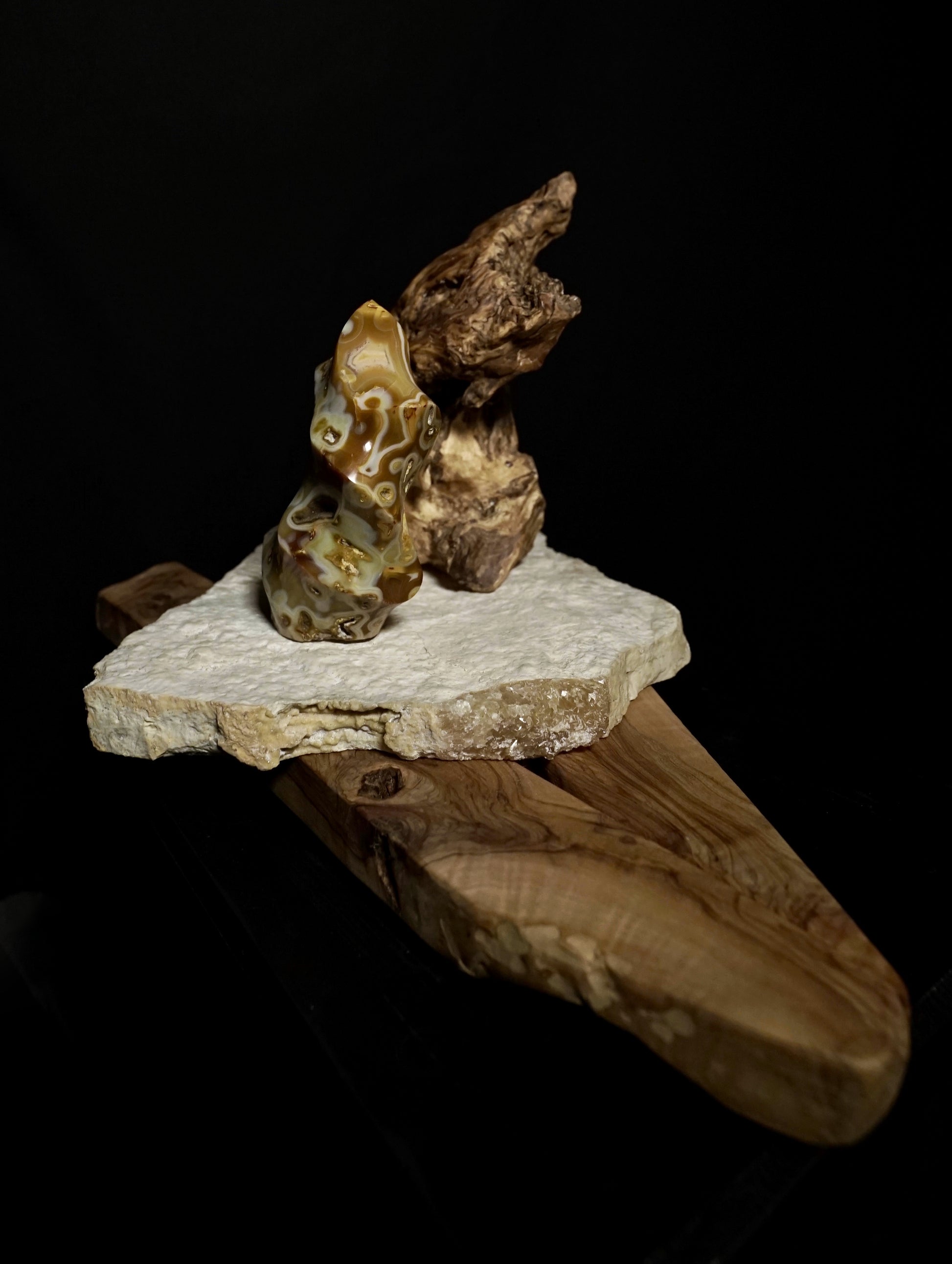 Scultura in legno d'ulivo, agata e pietra calcarea con quarzite