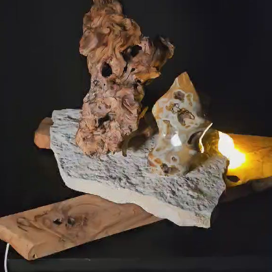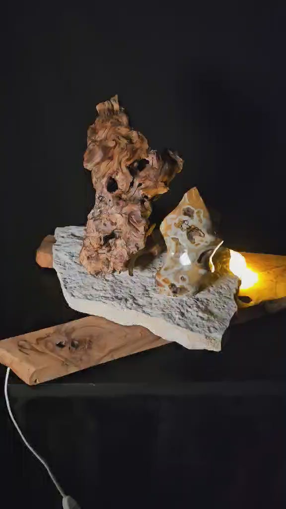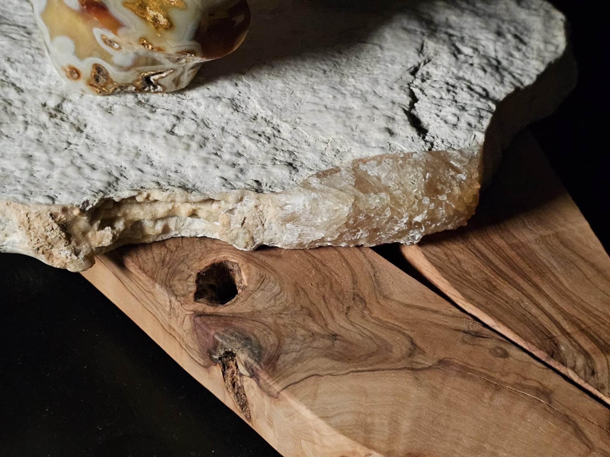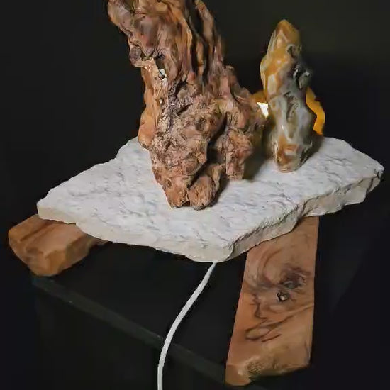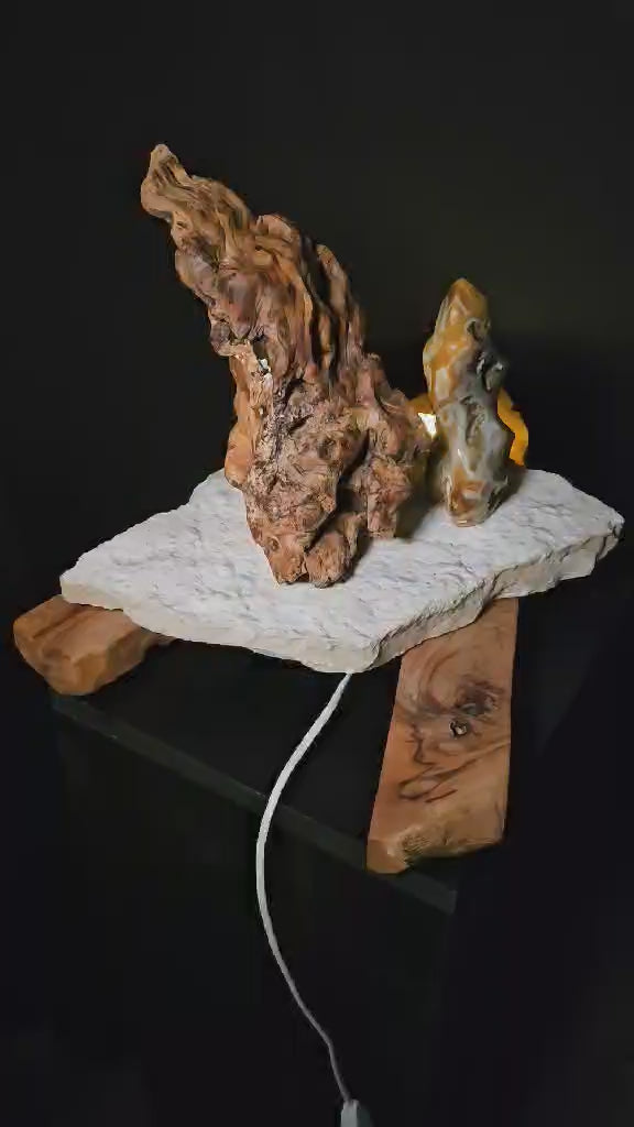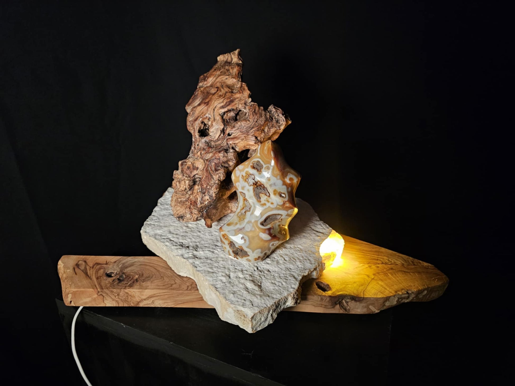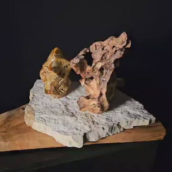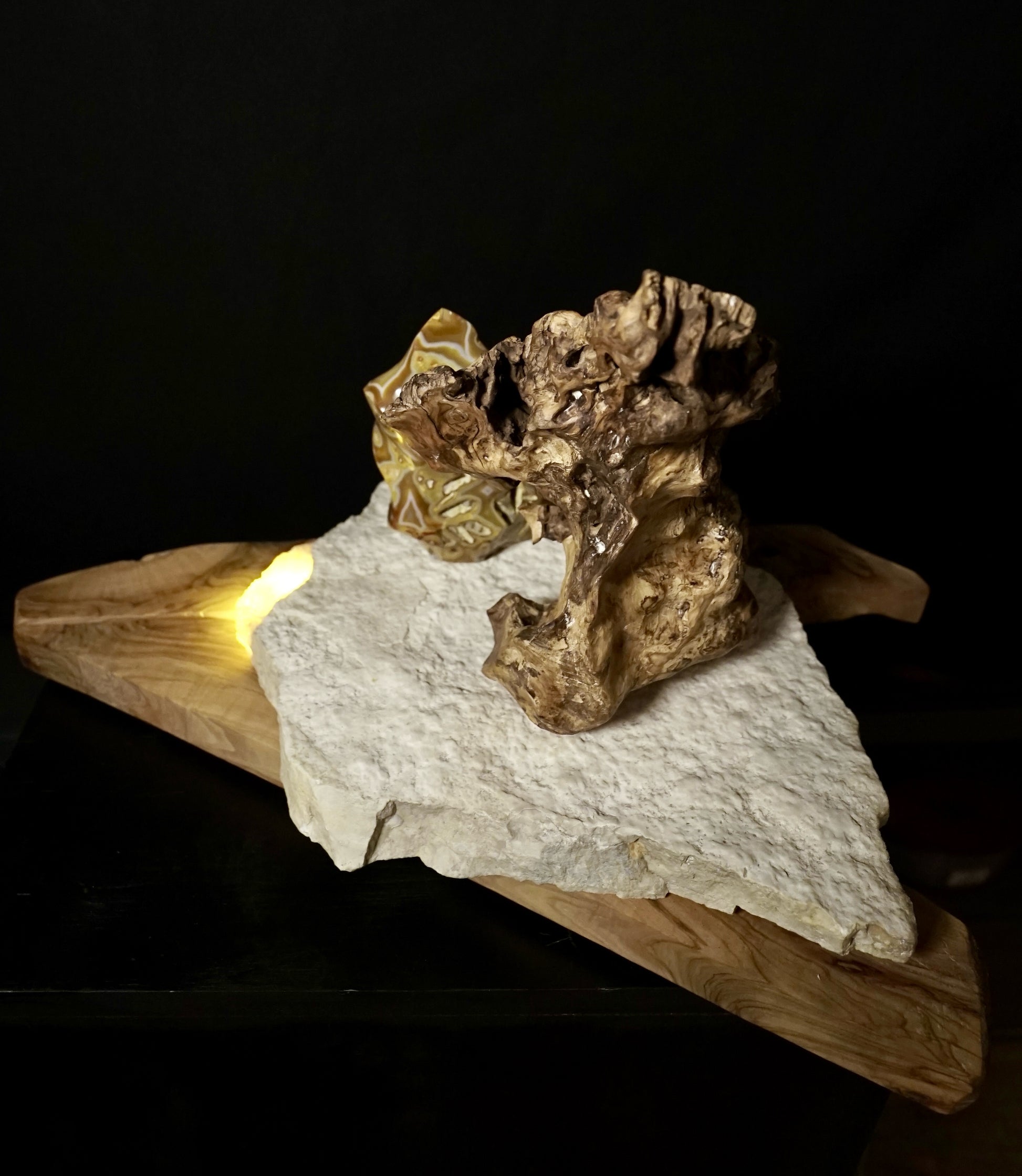 Scultura in legno d'ulivo, agata e pietra calcarea con quarzite