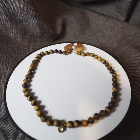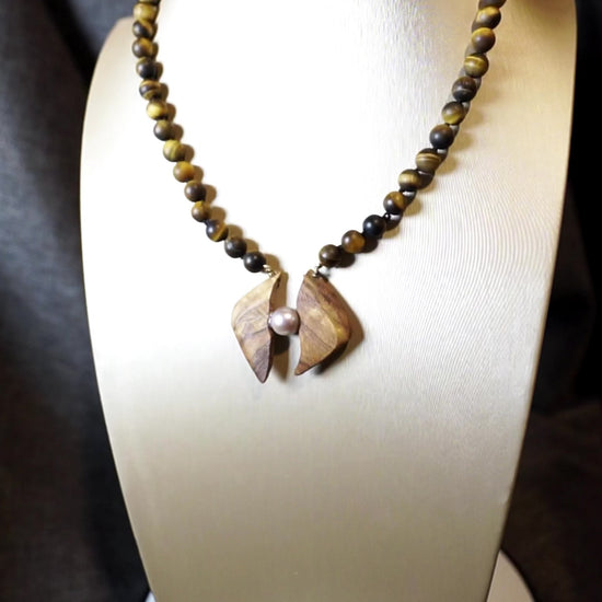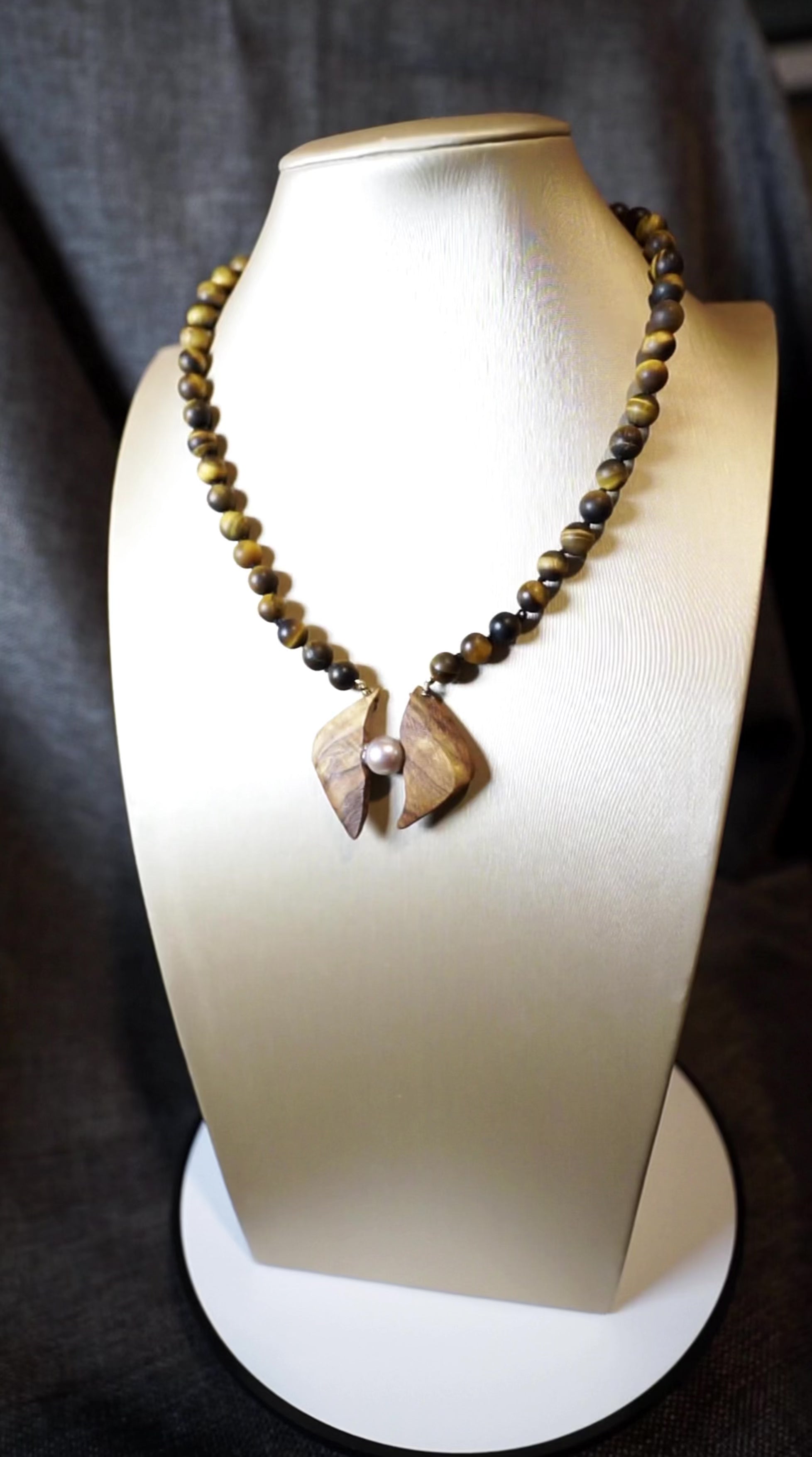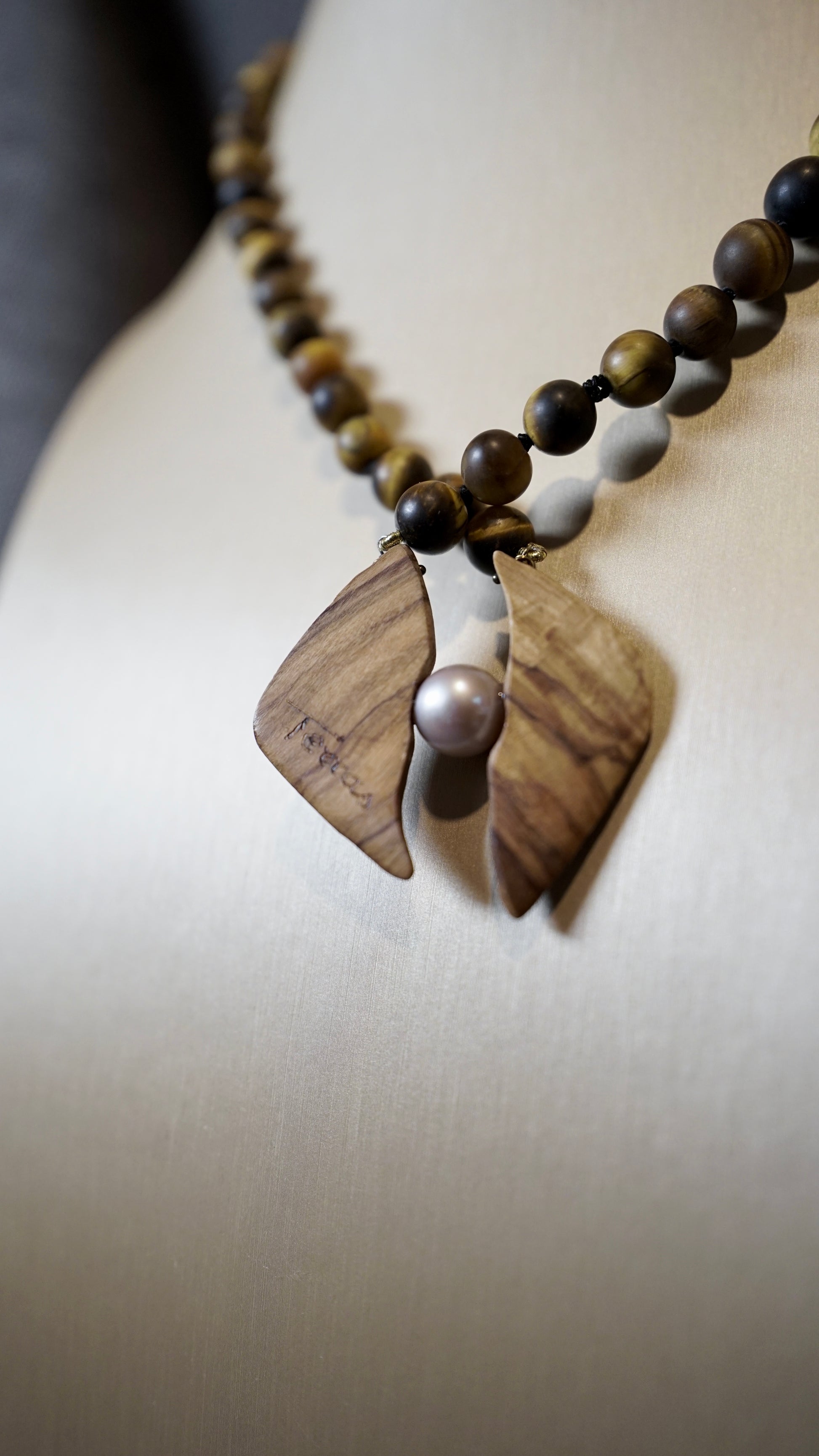 COD:TGU0003 – Collana Occhio di tigre opaco, legno d’ulivo pugliese, perla e argento 925