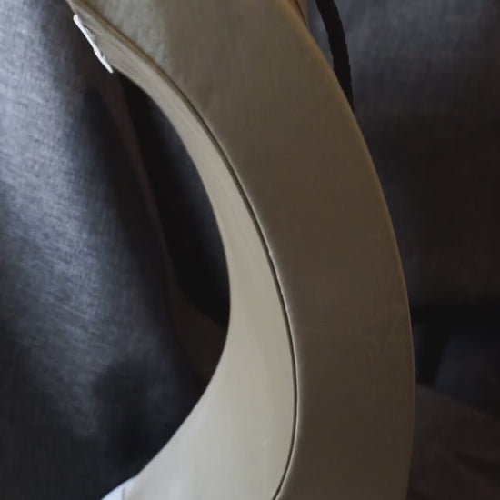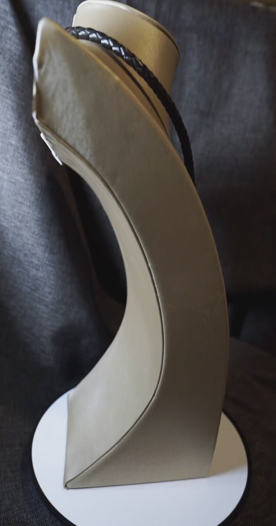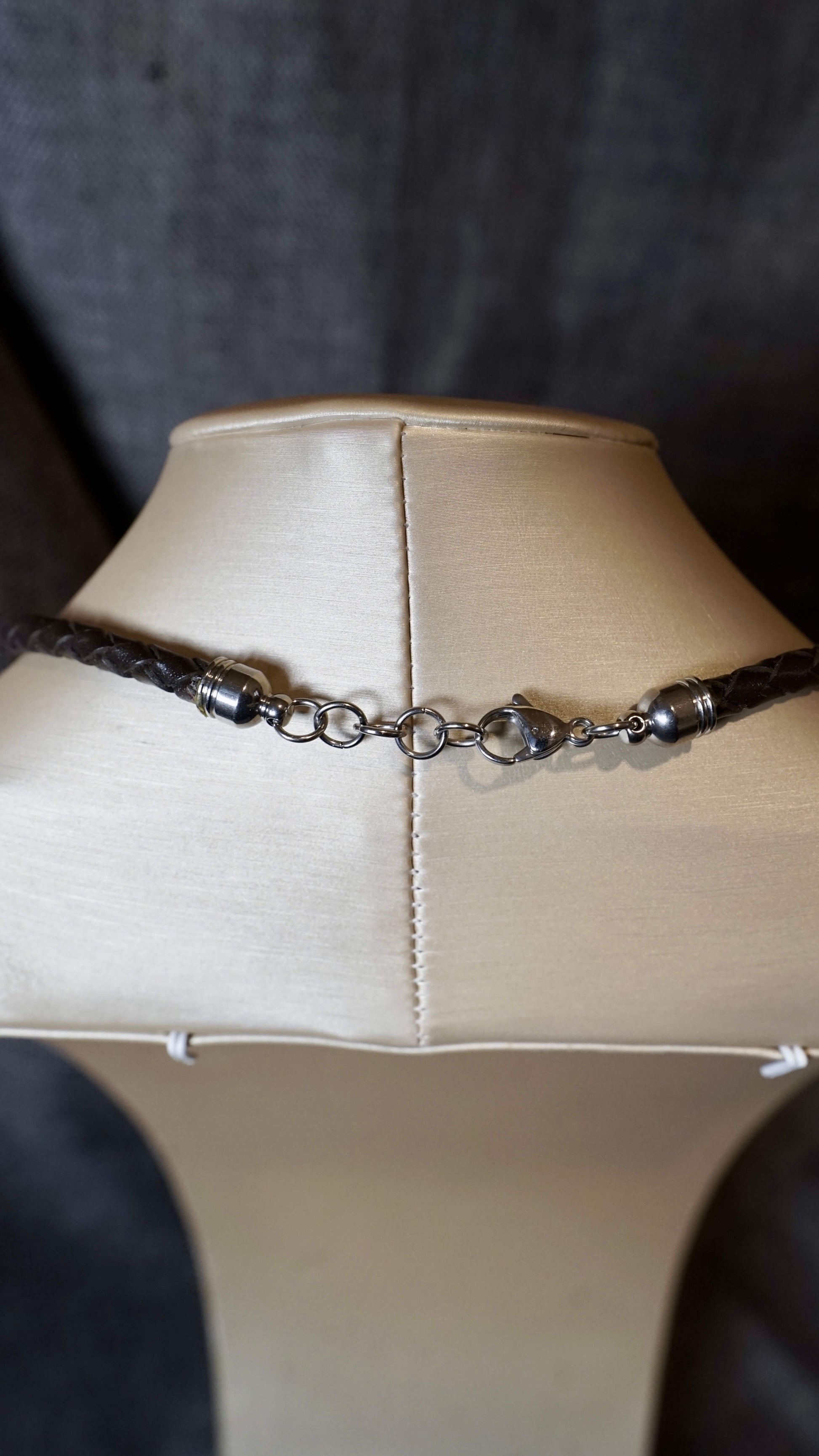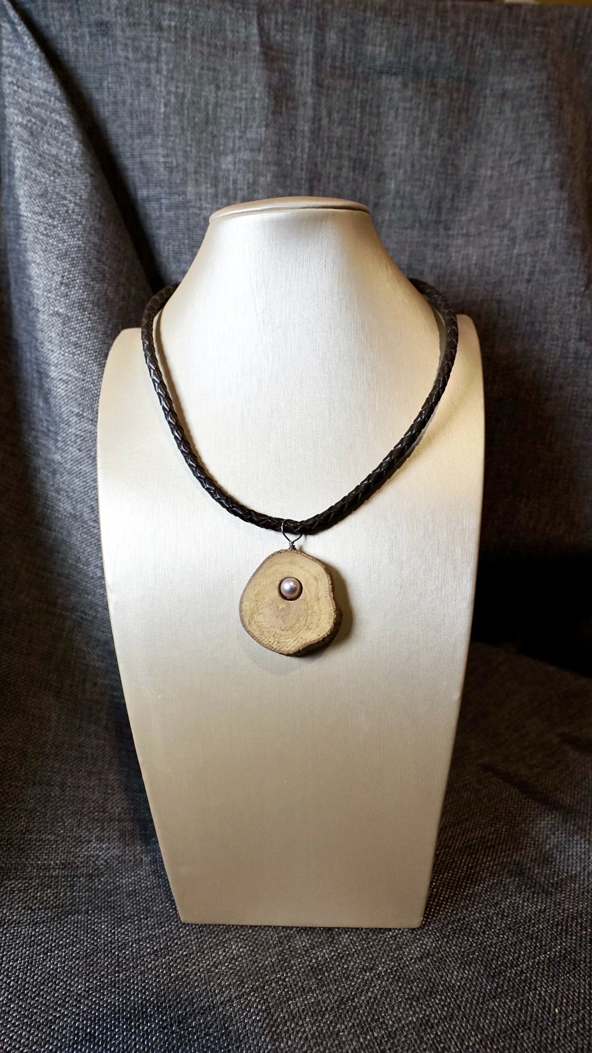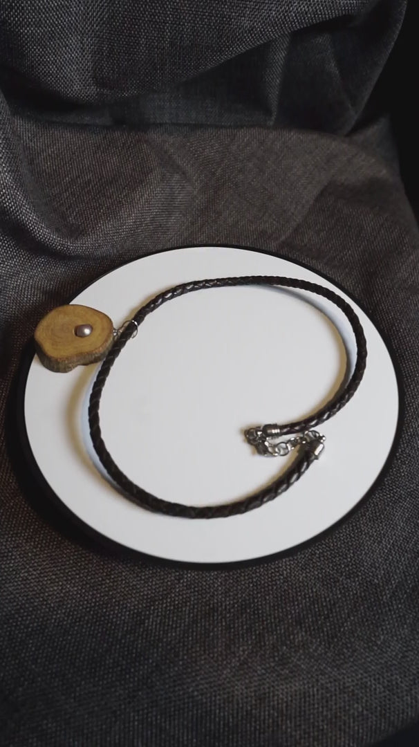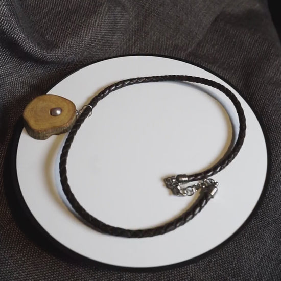 E' una collana semplice ma potente, dove il cuoio intrecciato e l’acciaio incontrano la dolcezza della perla e la forza del legno d’ulivo.