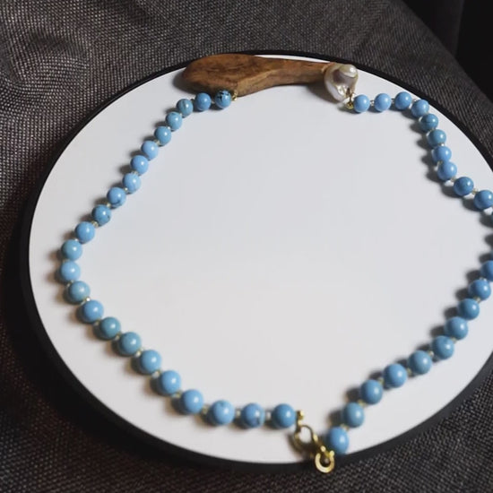 Questa collana accende il cuore con la forza giocosa del turchese, l’energia femminile della perla e il calore del legno d’ulivo.