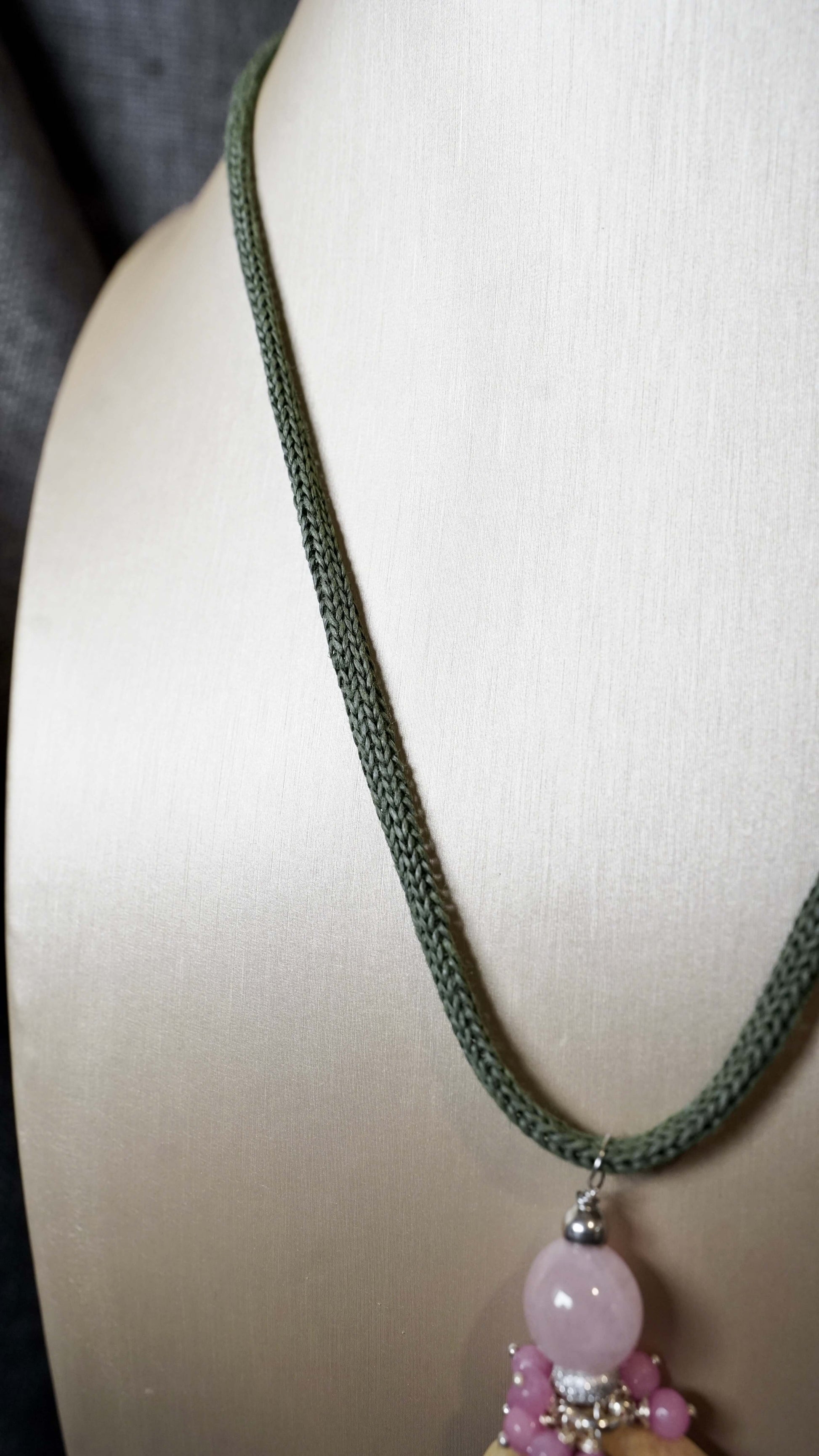 COD:TGU0006 – Collana- Legno d’ulivo, quarzo rosa, quarzi, argento 925, cordone in carta e acciaio