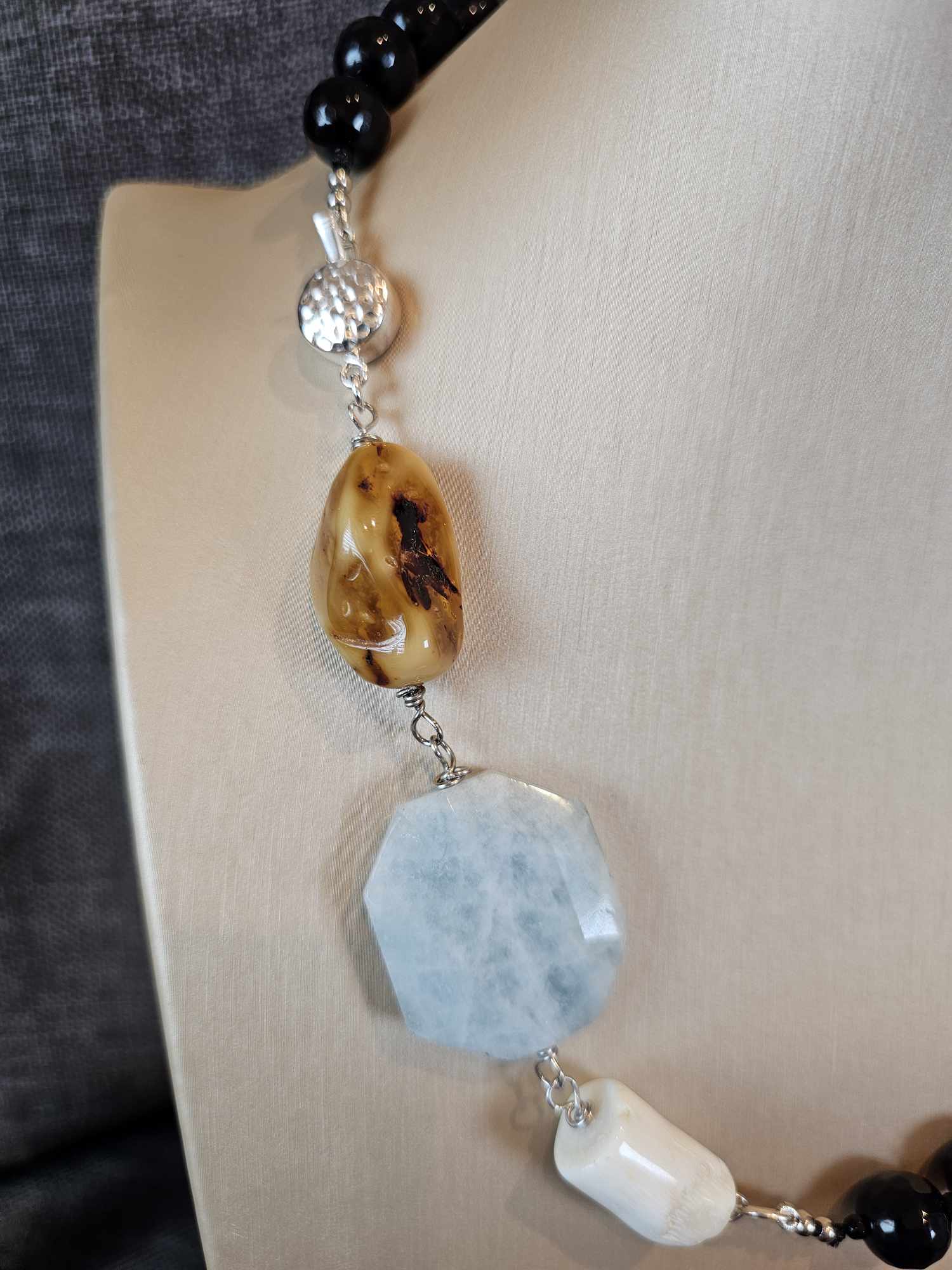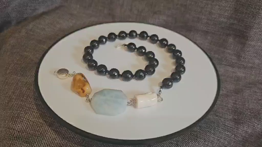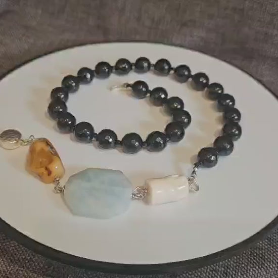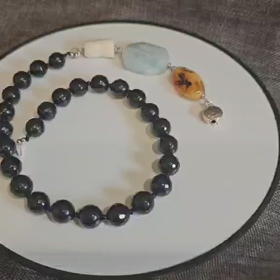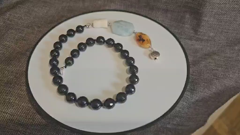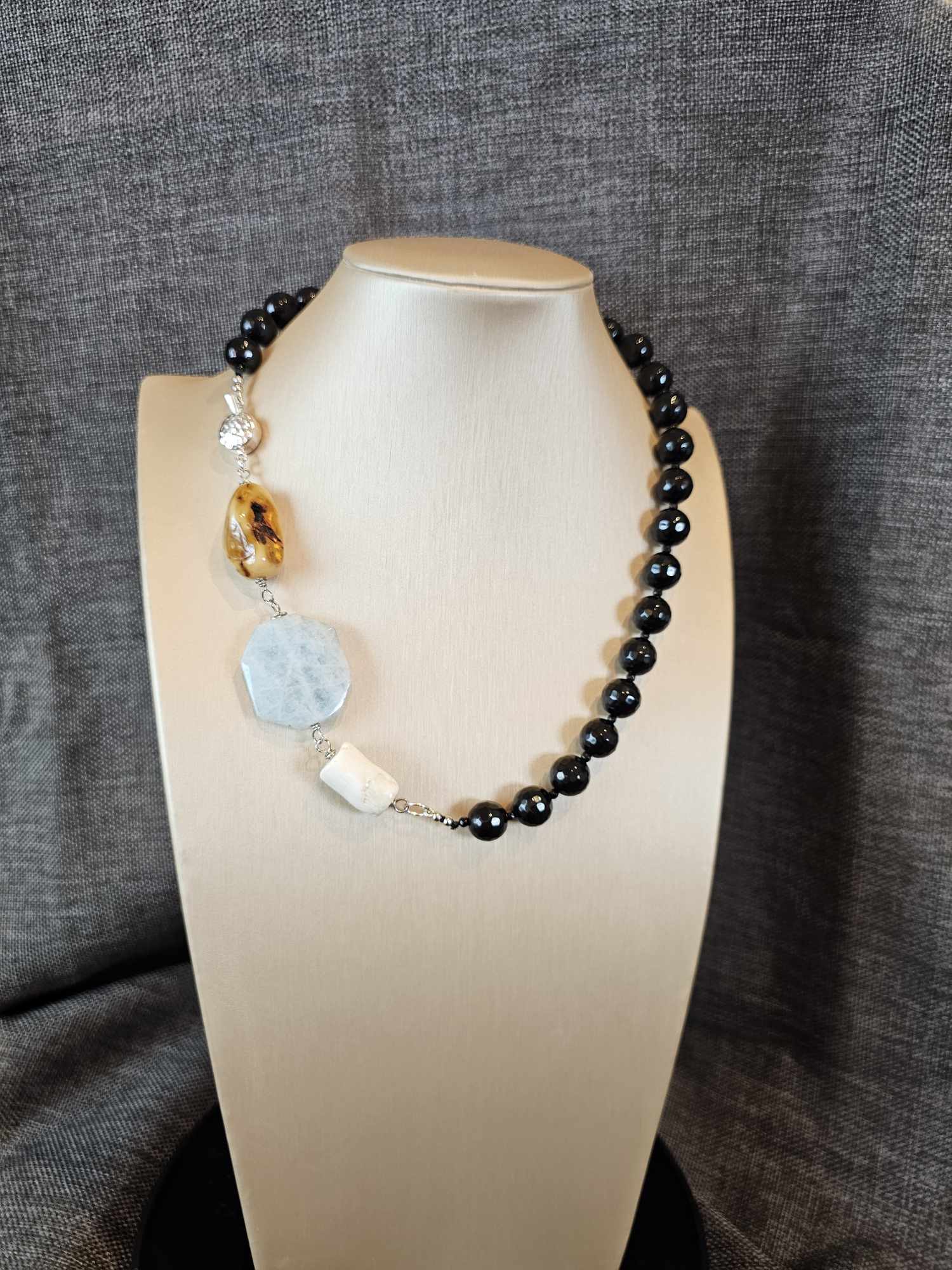 COD: TG0008- Collana – Agata nera, Acquamarina, Ambra, Osso e Argento 925