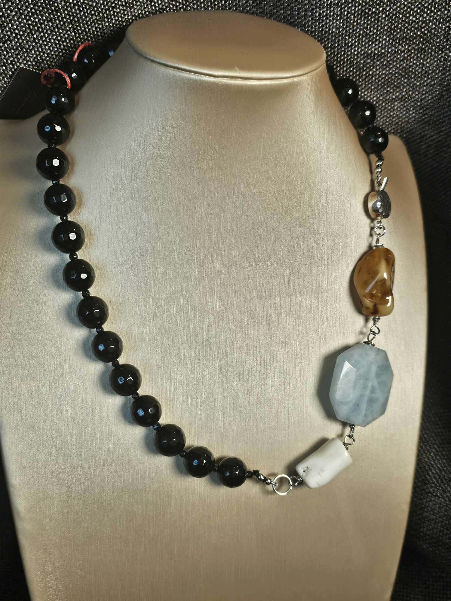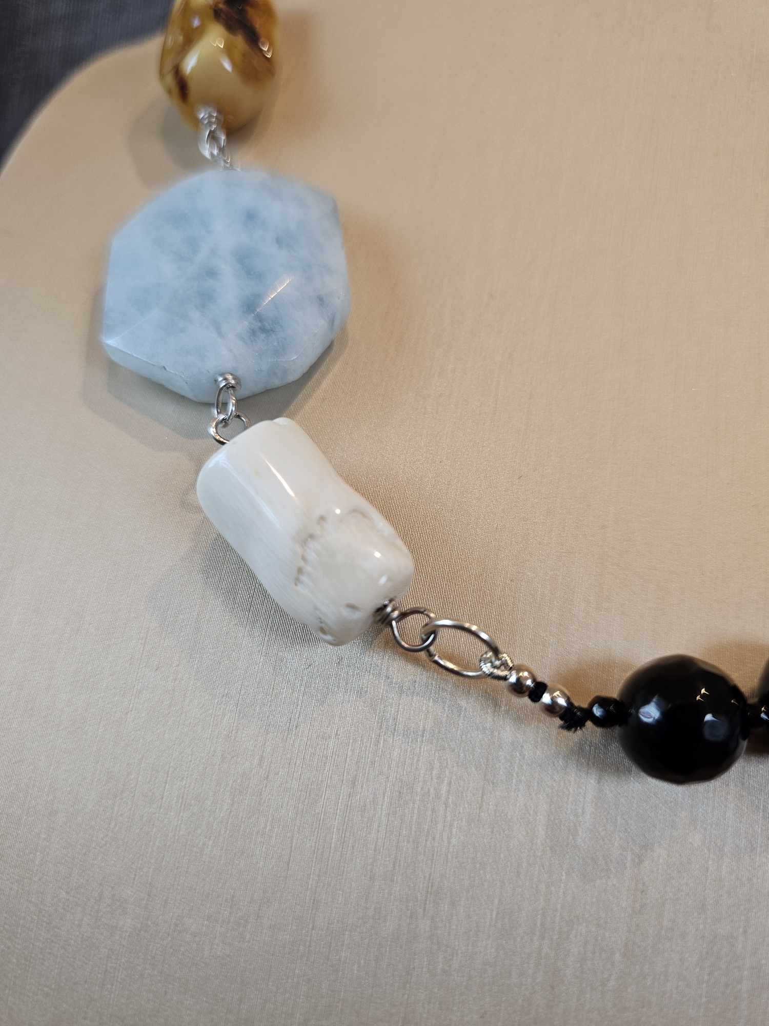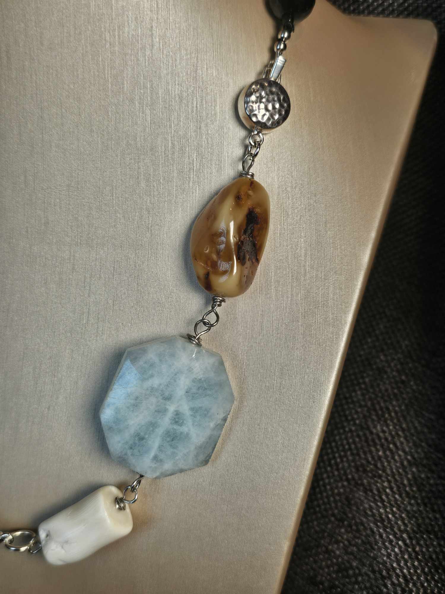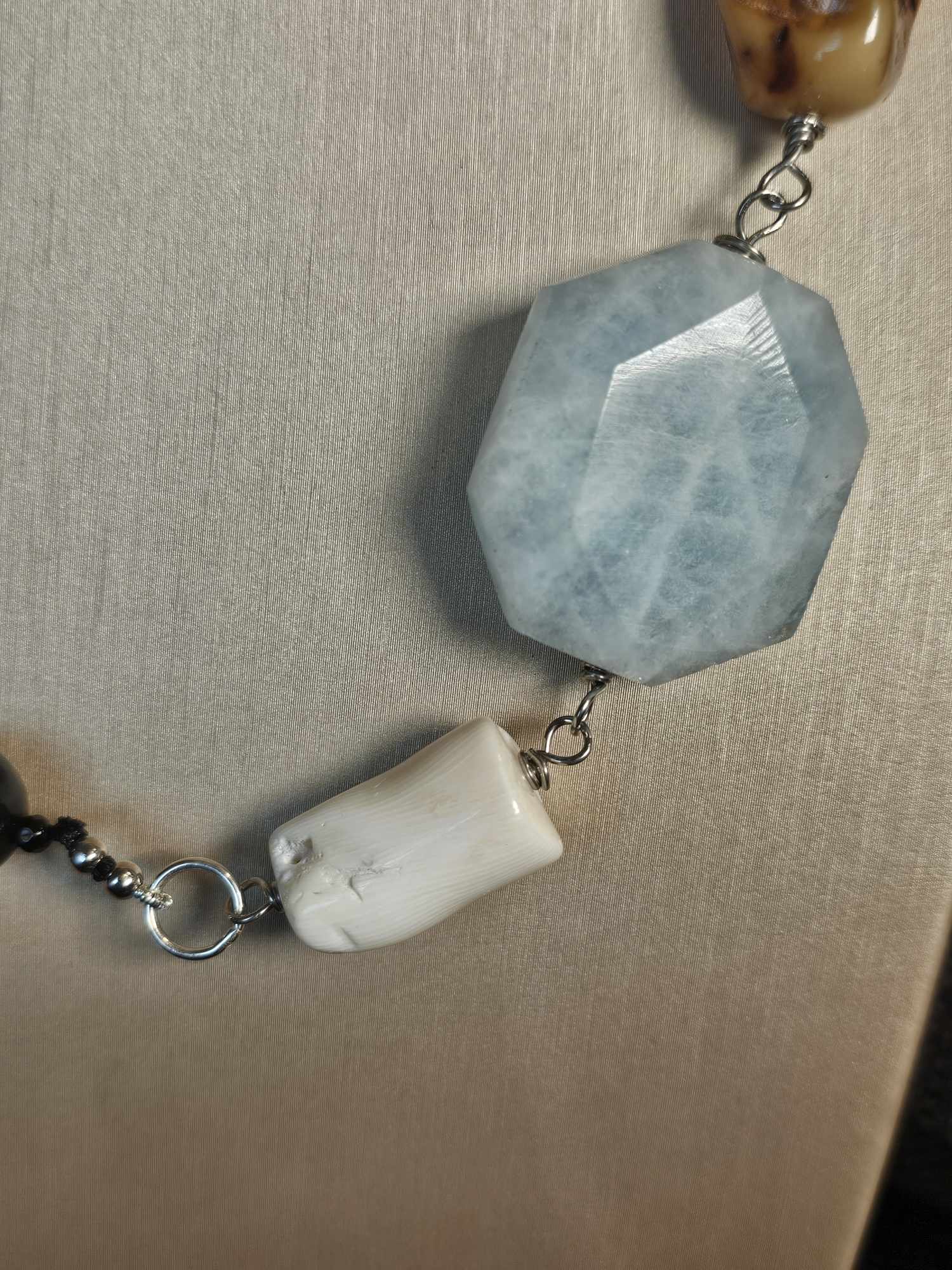 COD: TG0008- Collana – Agata nera, Acquamarina, Ambra, Osso e Argento 925