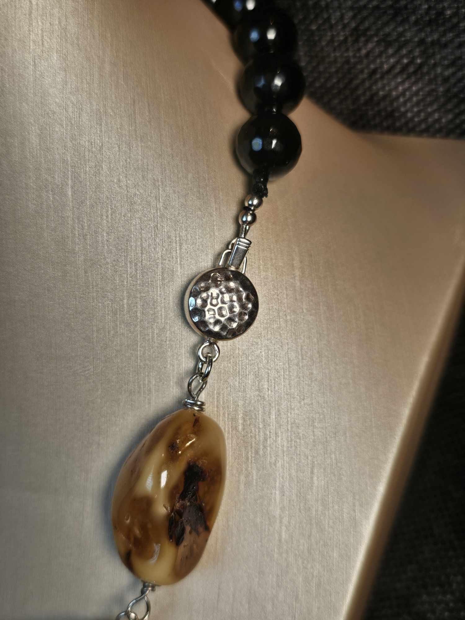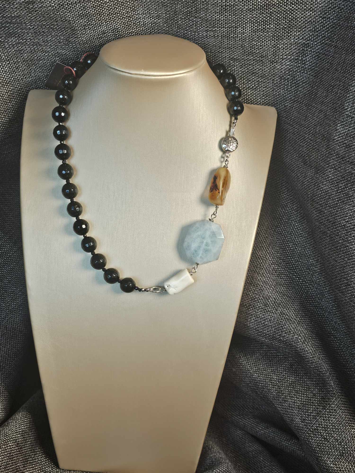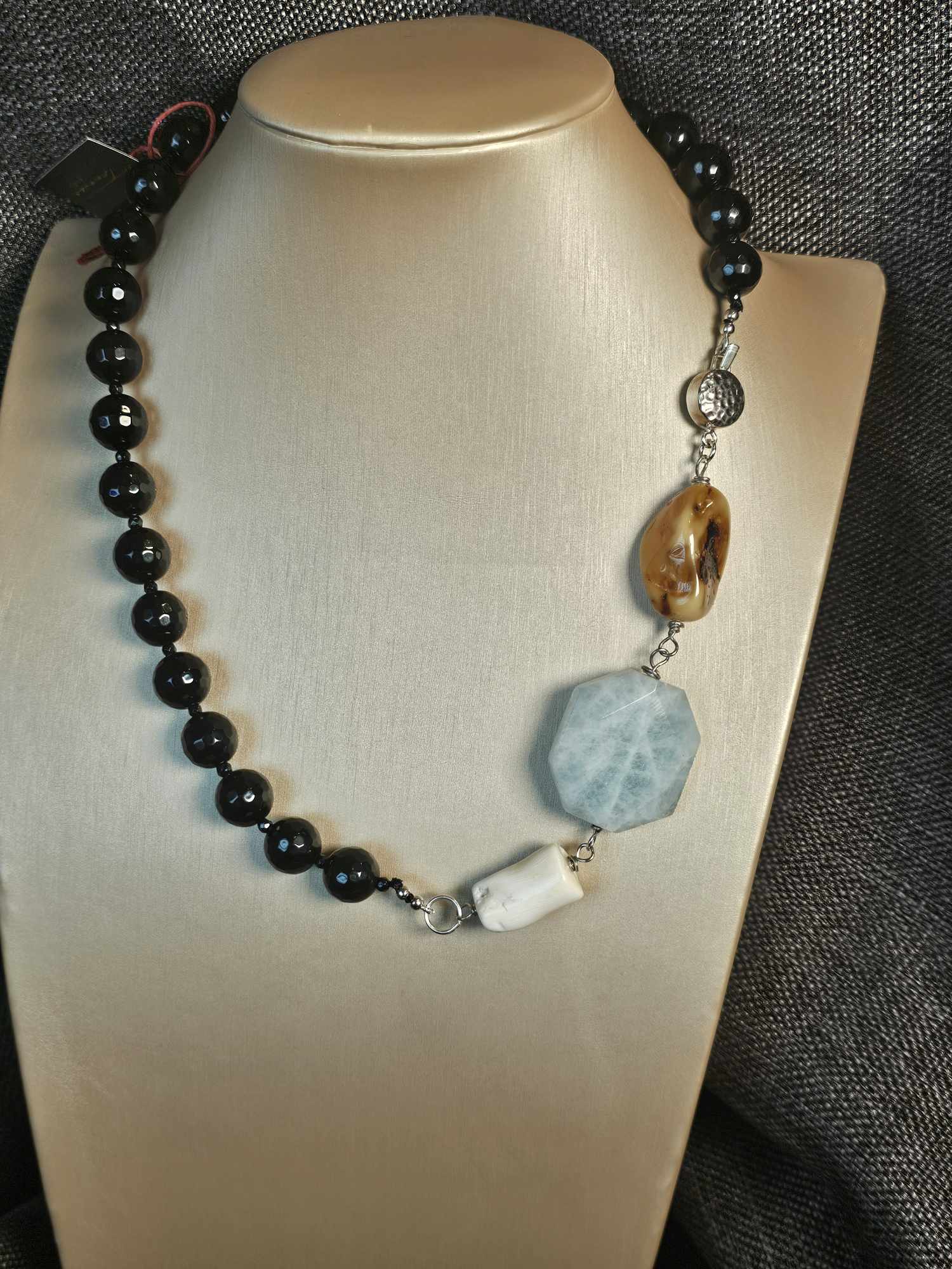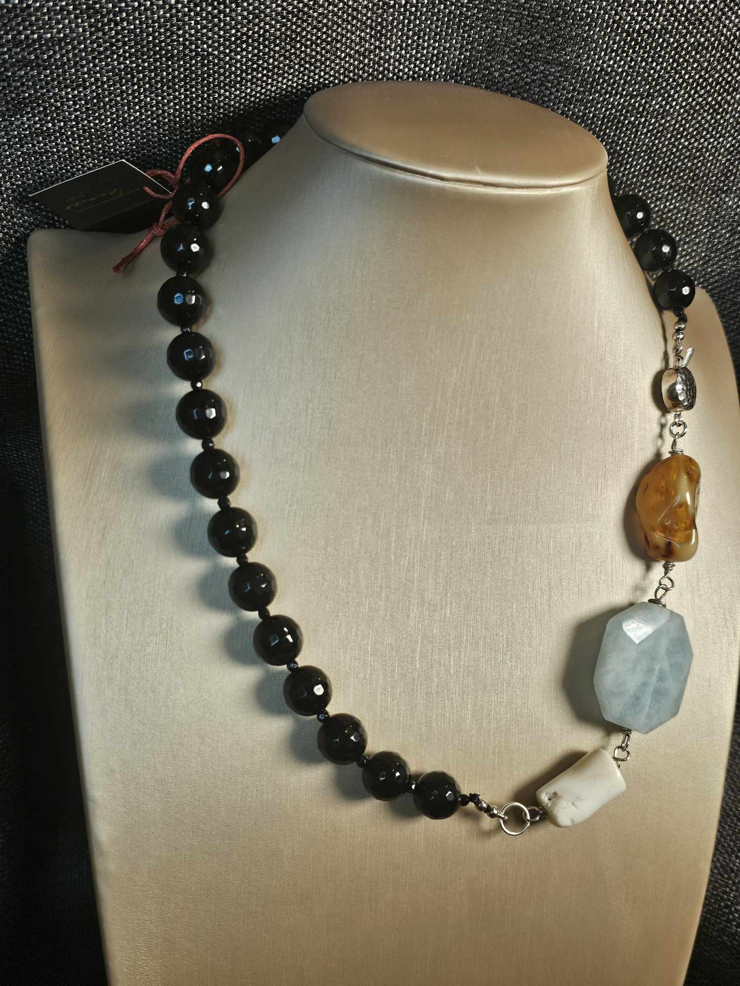 COD: TG0008- Collana – Agata nera, Acquamarina, Ambra, Osso e Argento 925