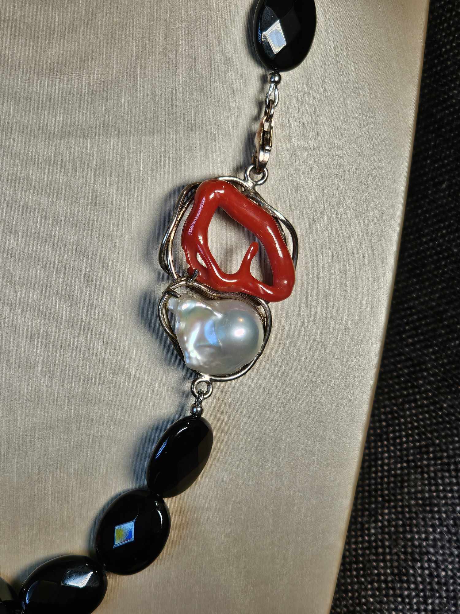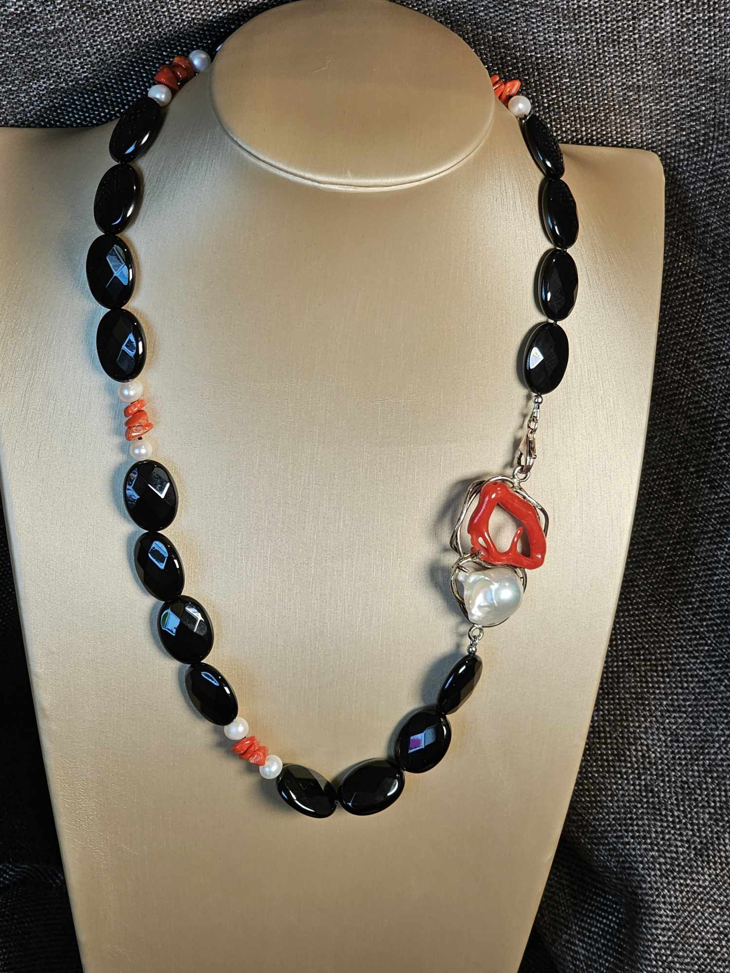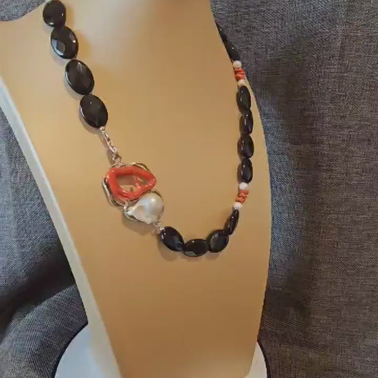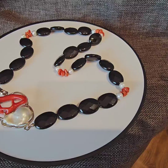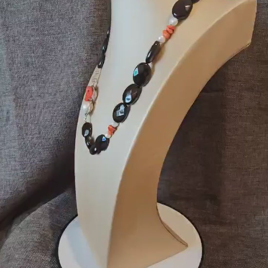 COD: TG0006- Collana – Agata nera, Corallo del Mediterraneo, Perla e Argento 925