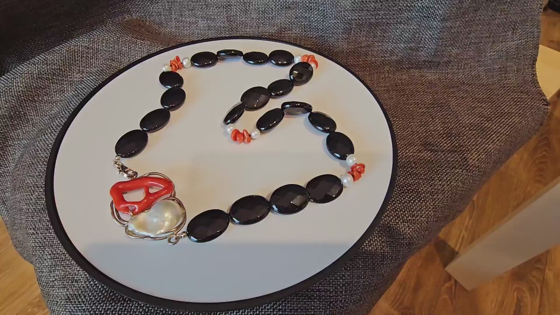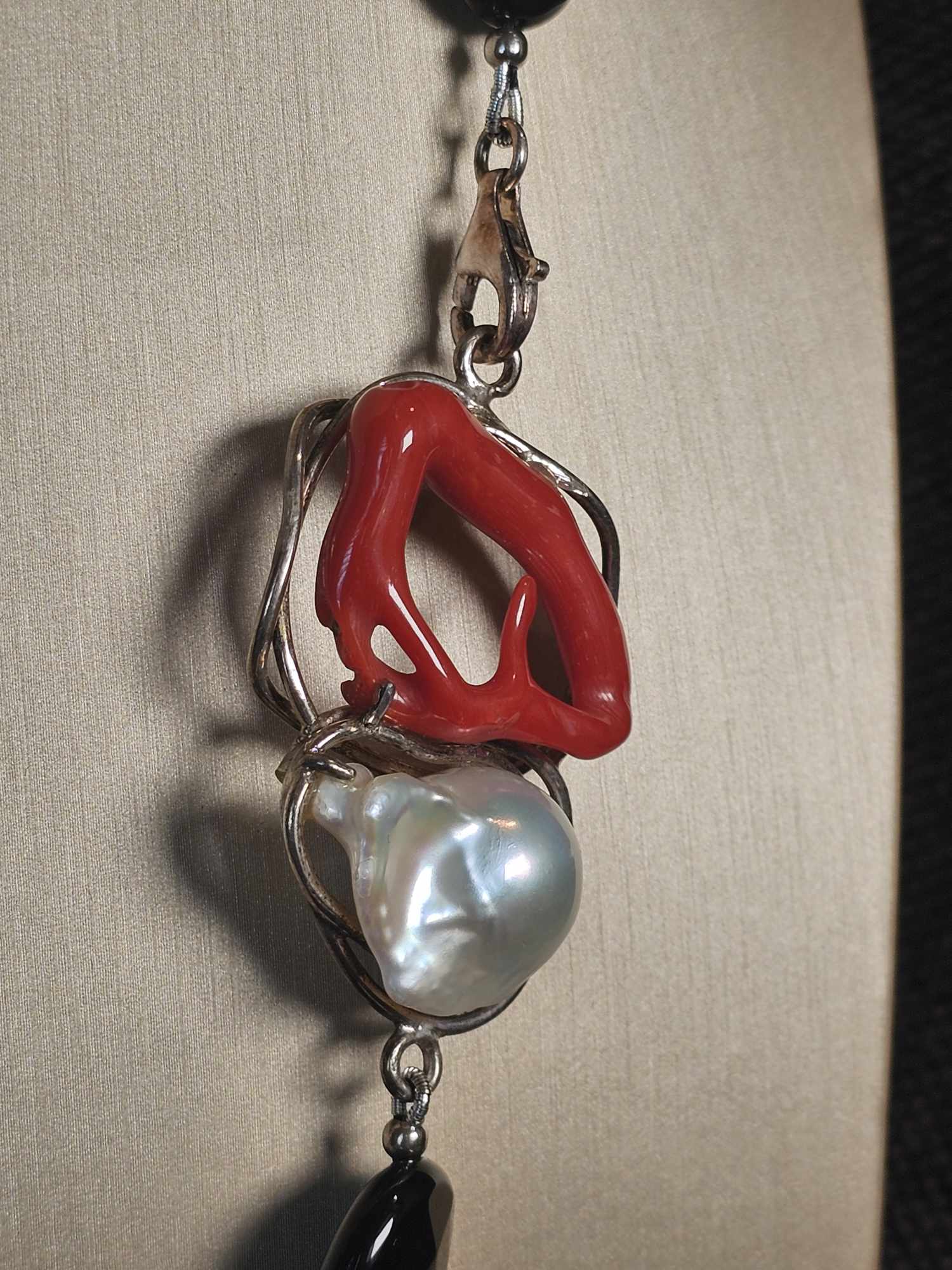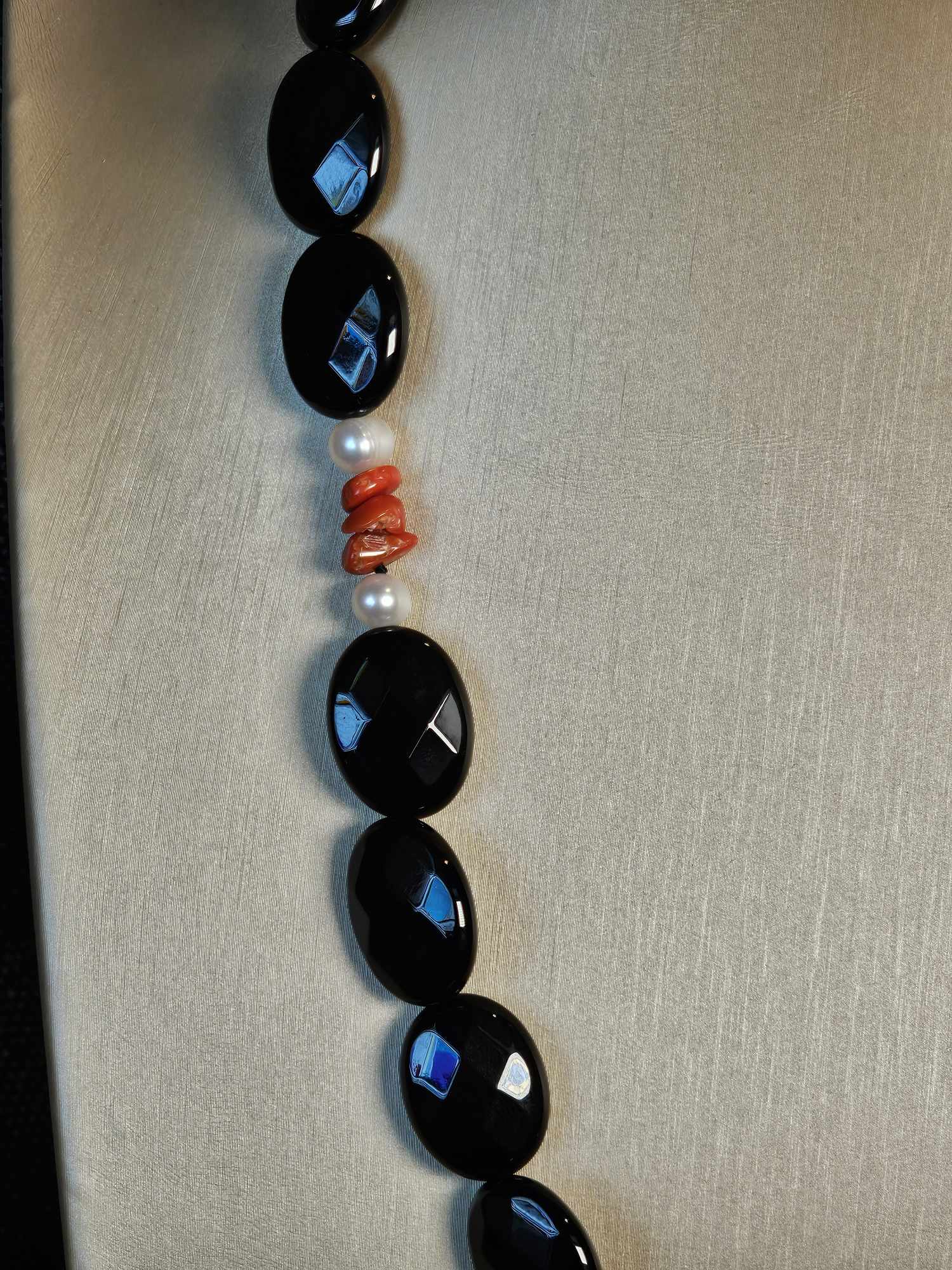 COD: TG0006- Collana – Agata nera, Corallo del Mediterraneo, Perla e Argento 925