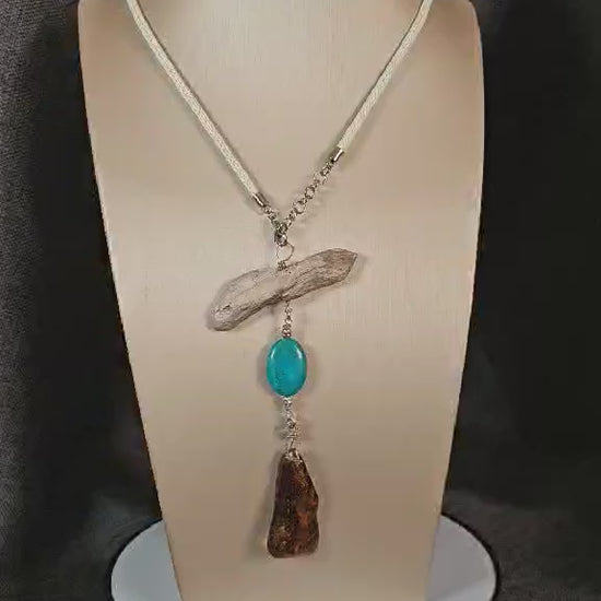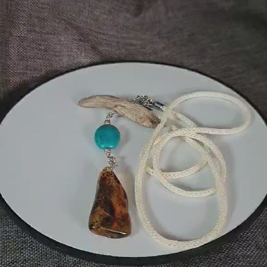 COD:TG0010 – Collana in ambra, turchese, legno di mare e argento 925