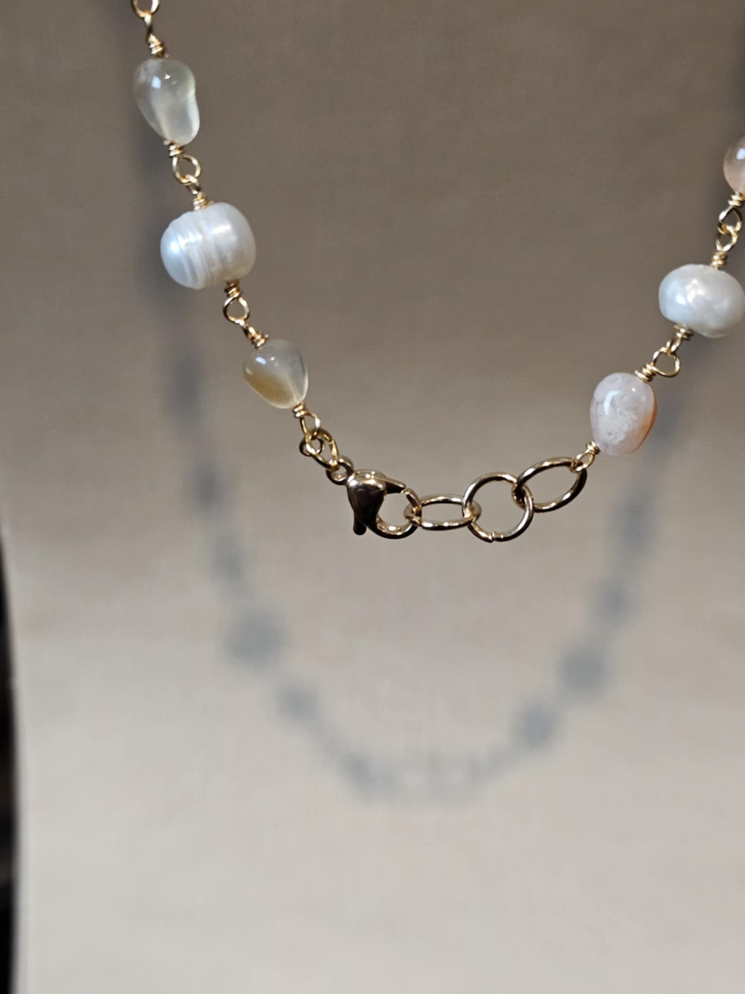 Le agate donano equilibrio, le perle d’acqua dolce elevano la dolcezza emotiva e la pietra paesina connette alla stabilità e alla presenza.
