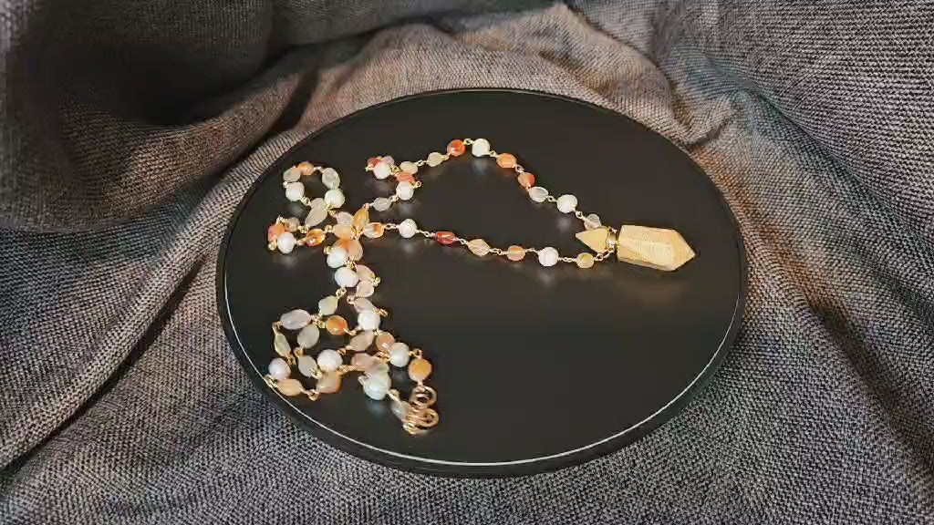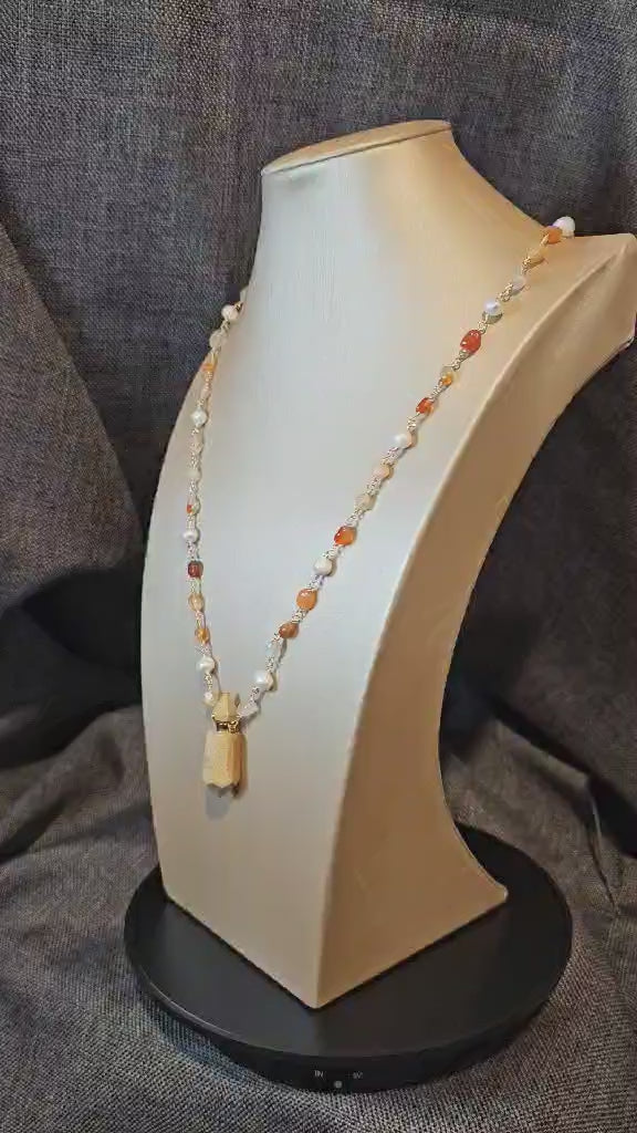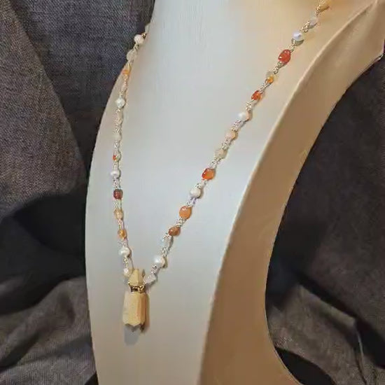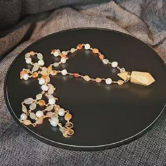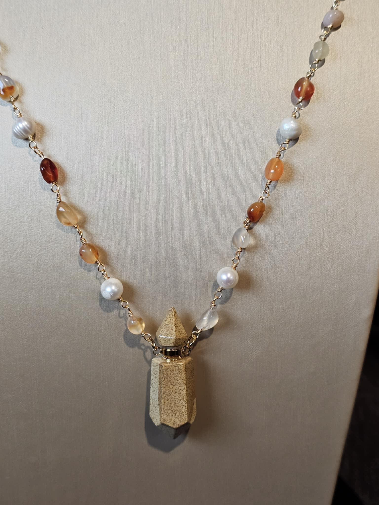 COD:TGP0001 – Collana lunga porta-essenze in agata, perle, pietra paesina e acciaio/ottone