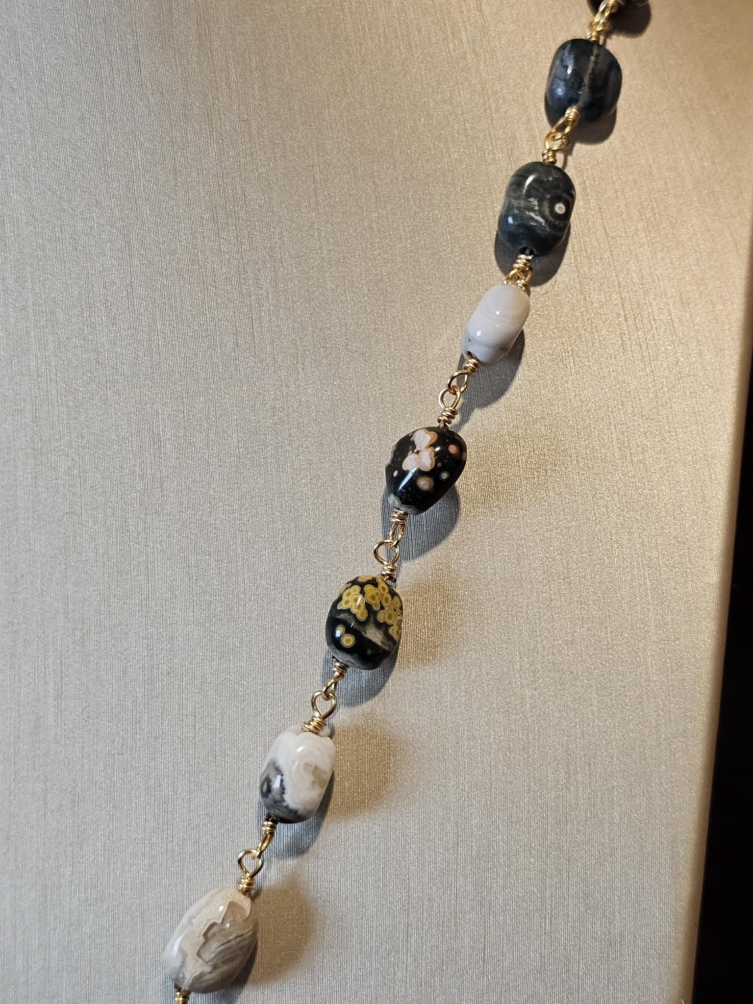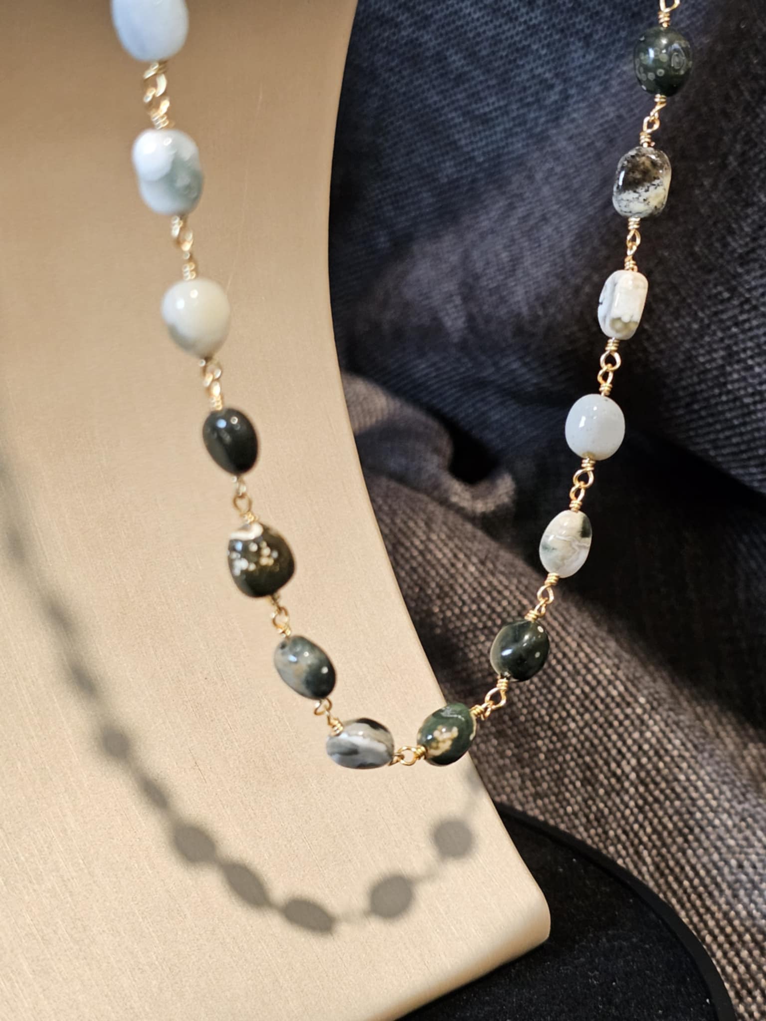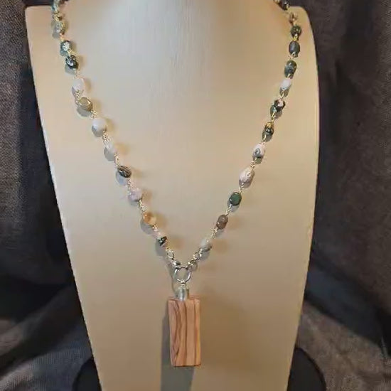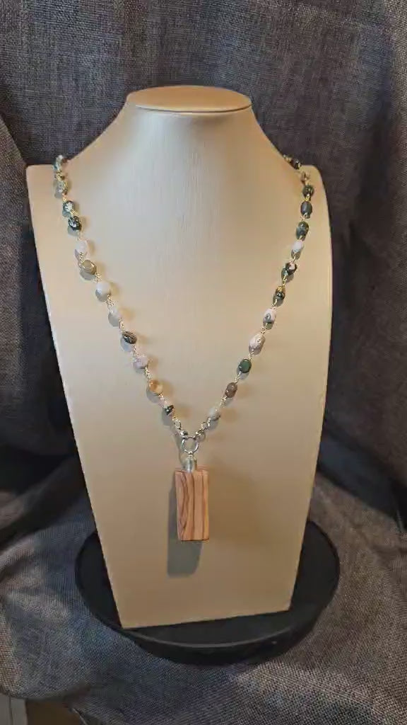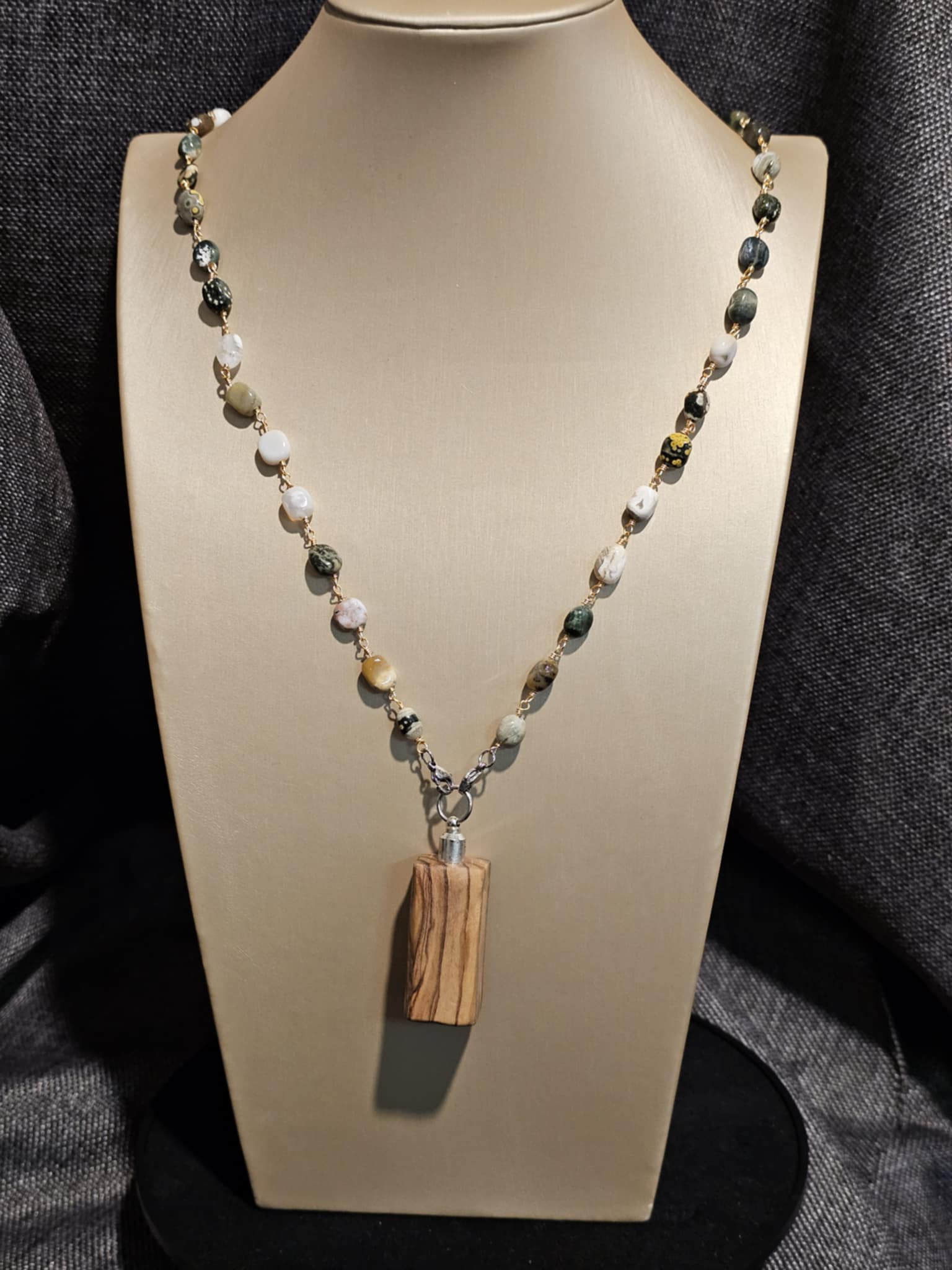 COD:TGP0004 – Collana lunga porta-essenze in legno di ulivo, agata e acciaio/ottone