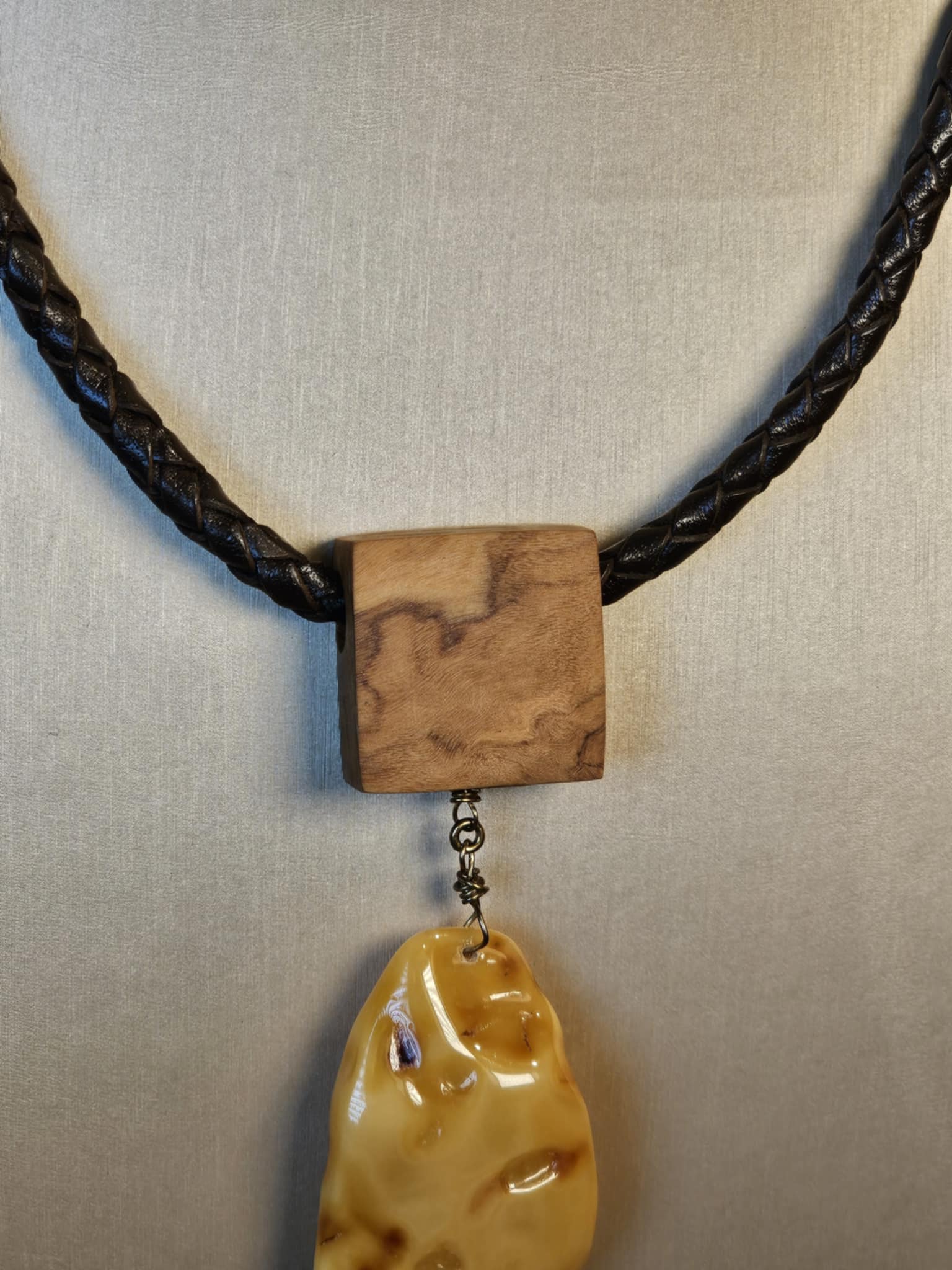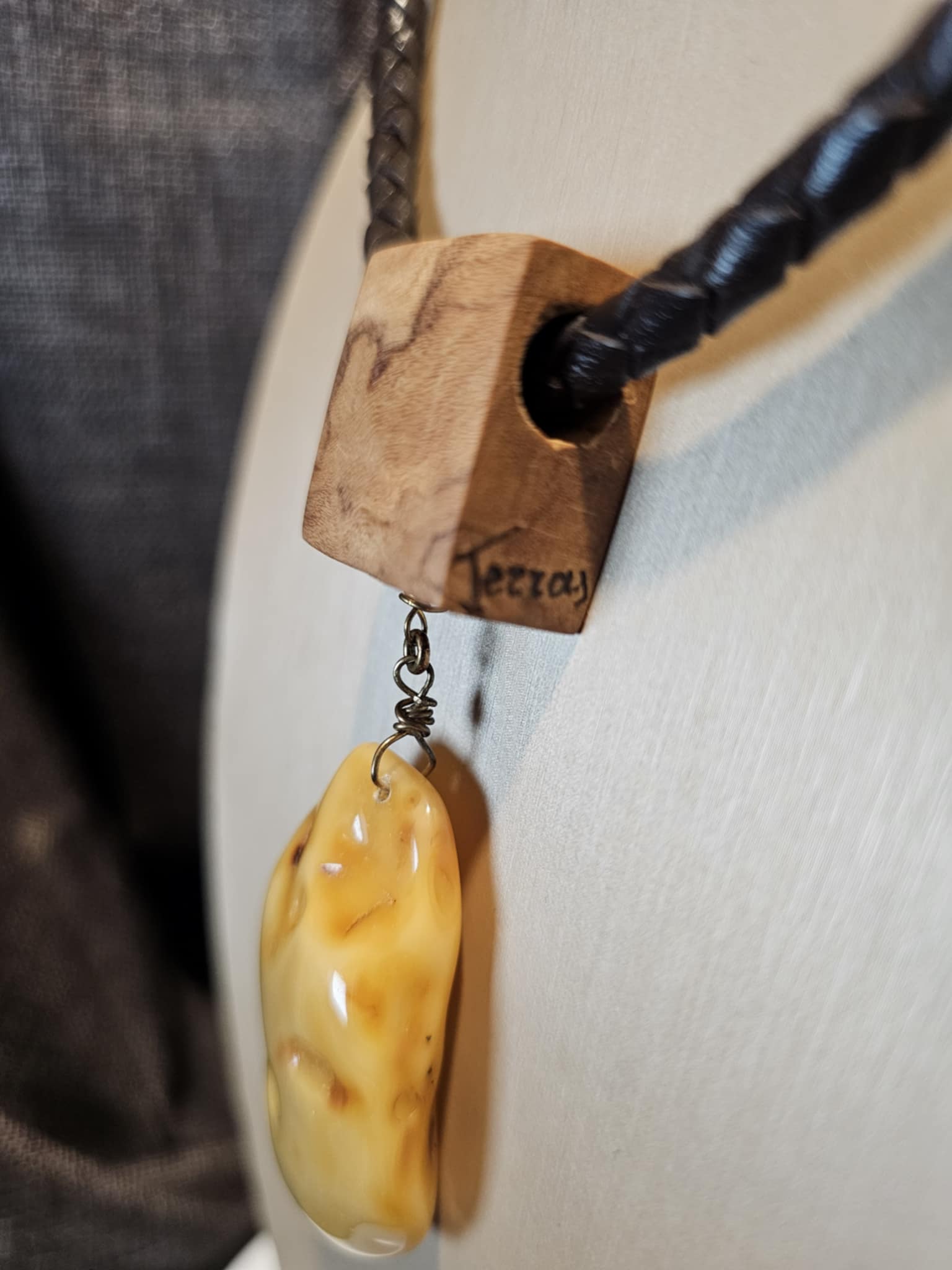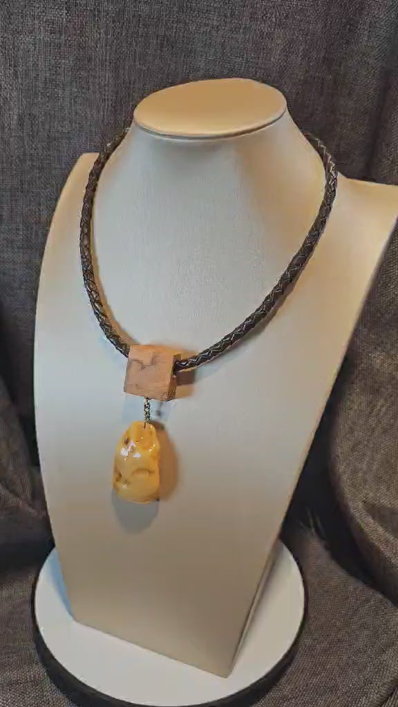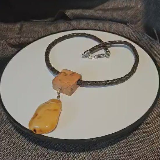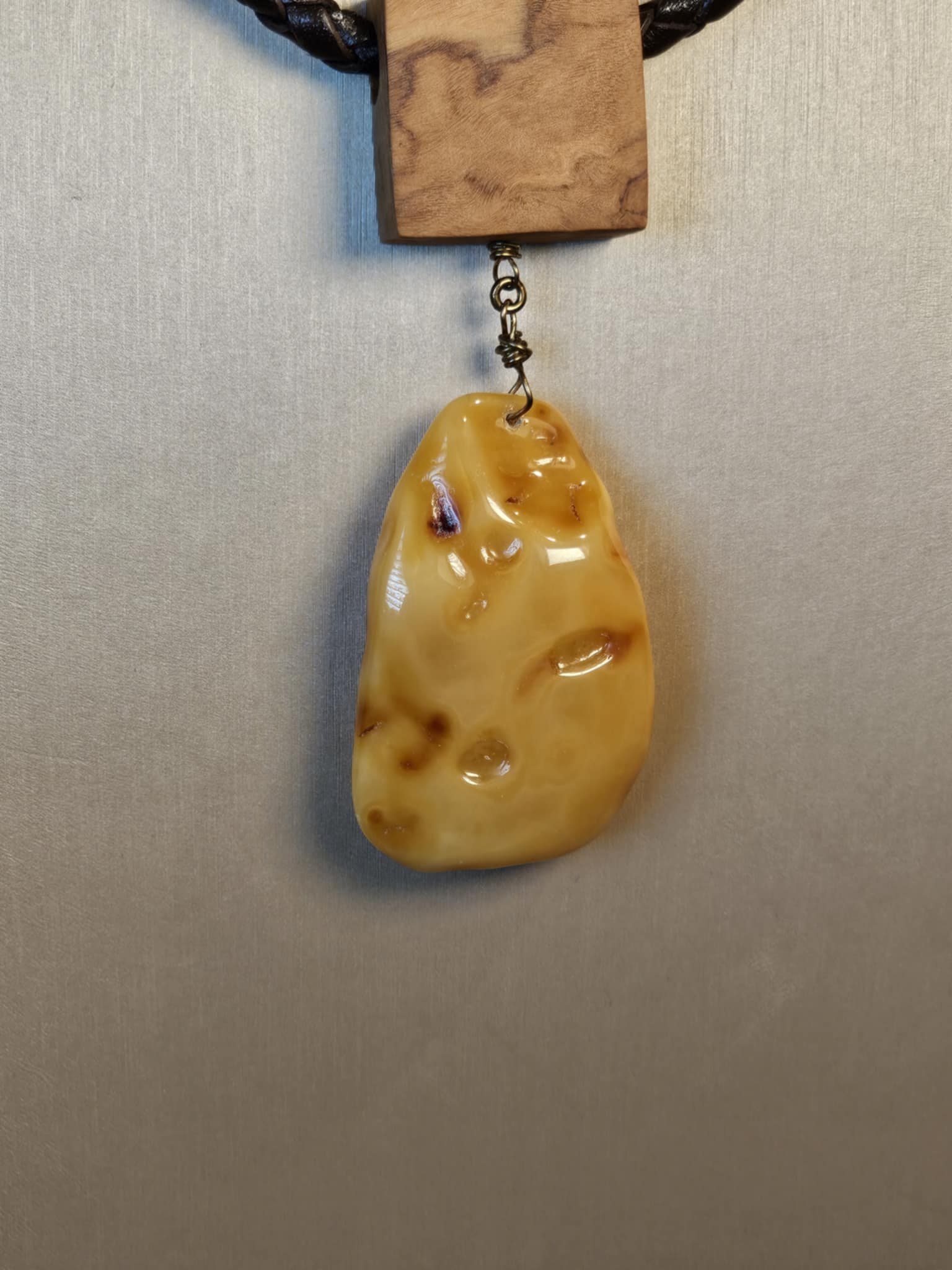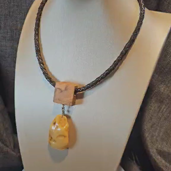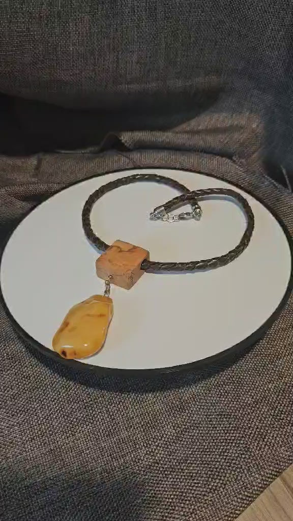 COD: TGU0002- Collana – Legno di Ulivo, Ambra, Cuoio e Argento 925