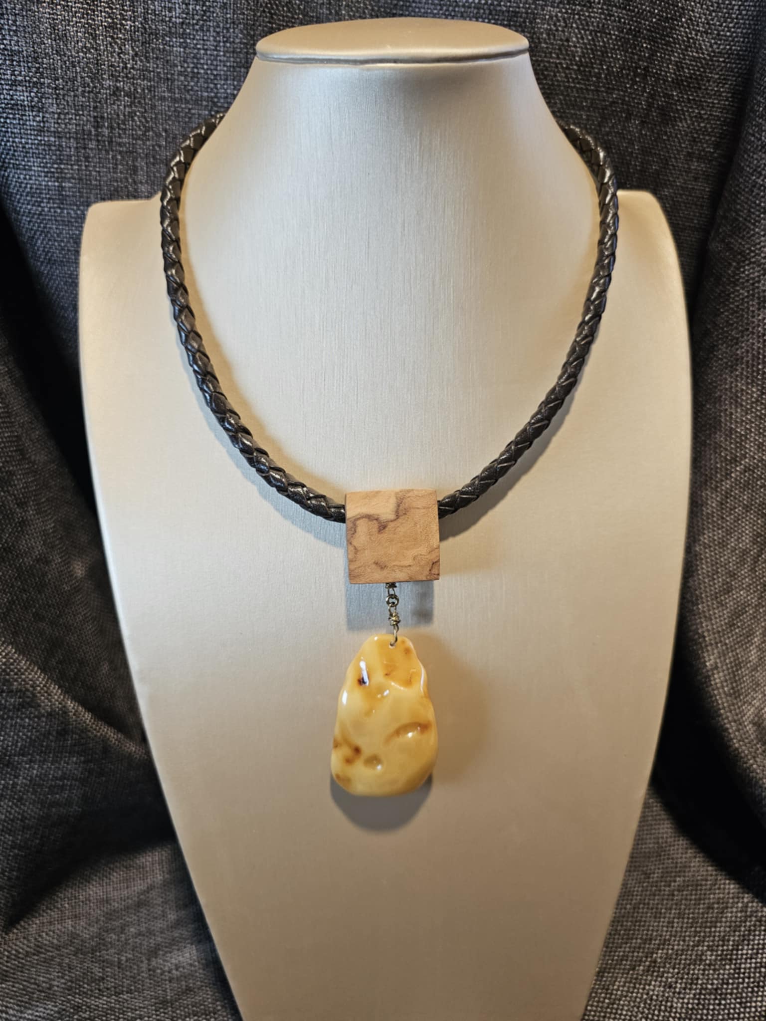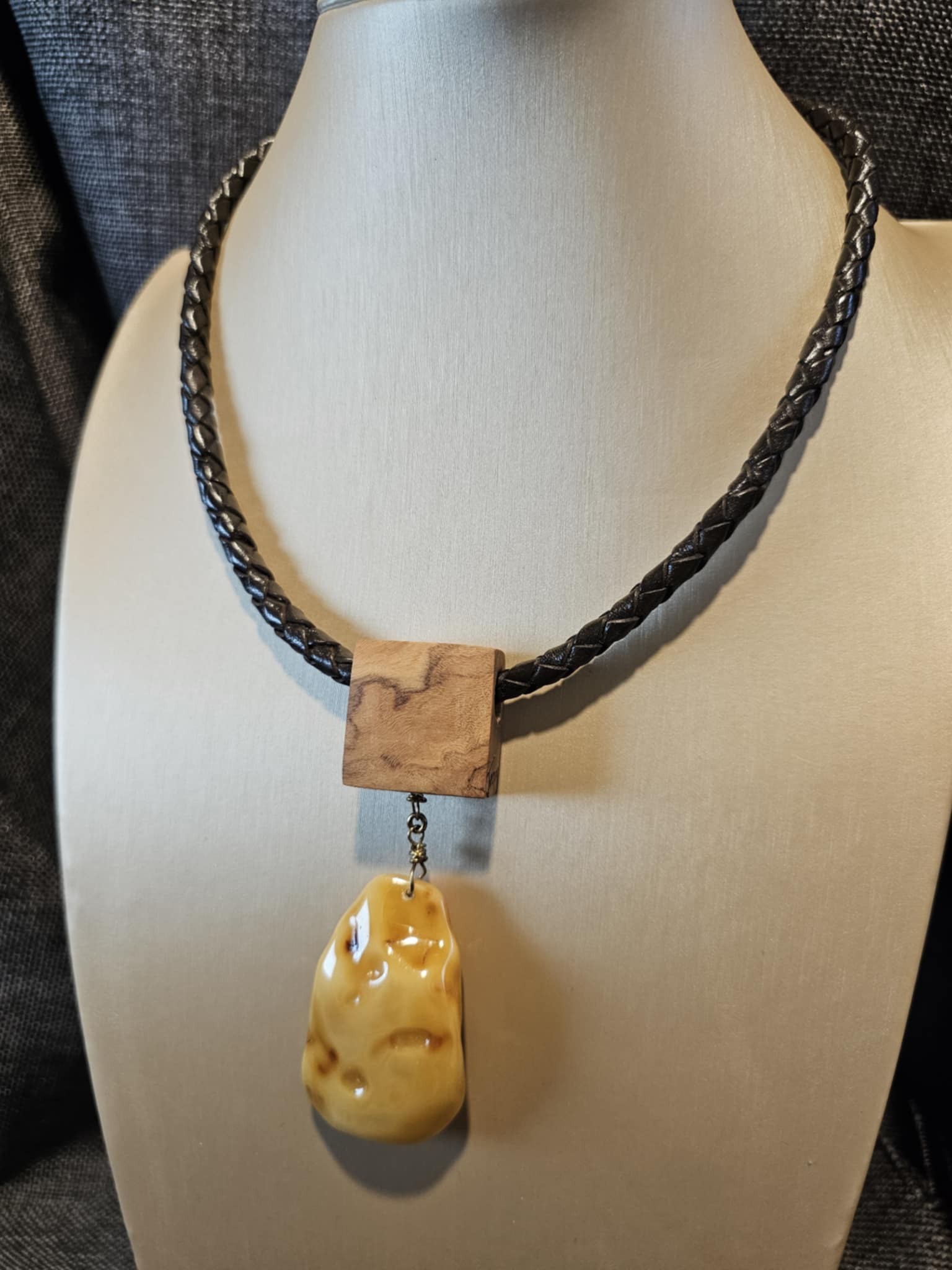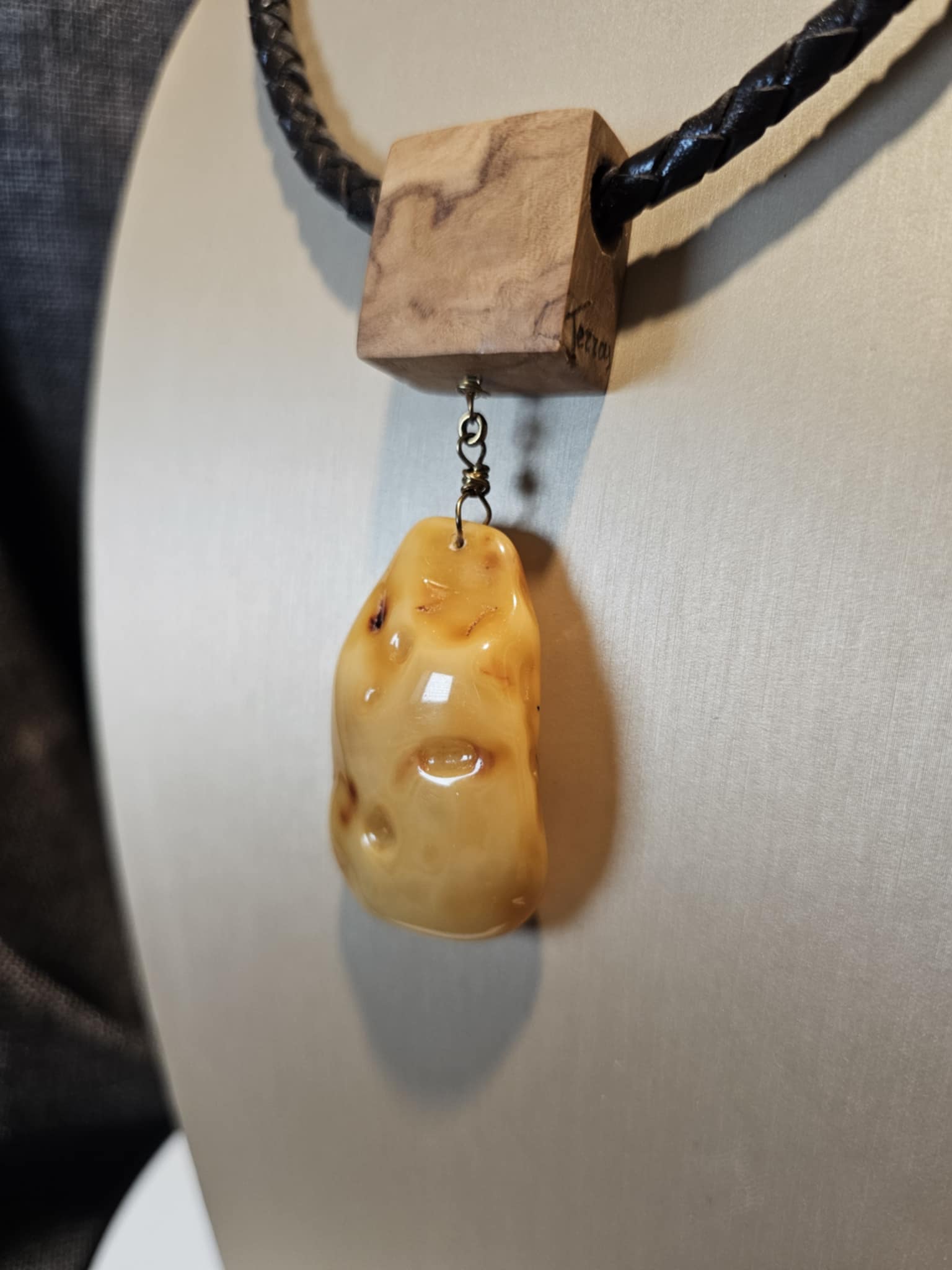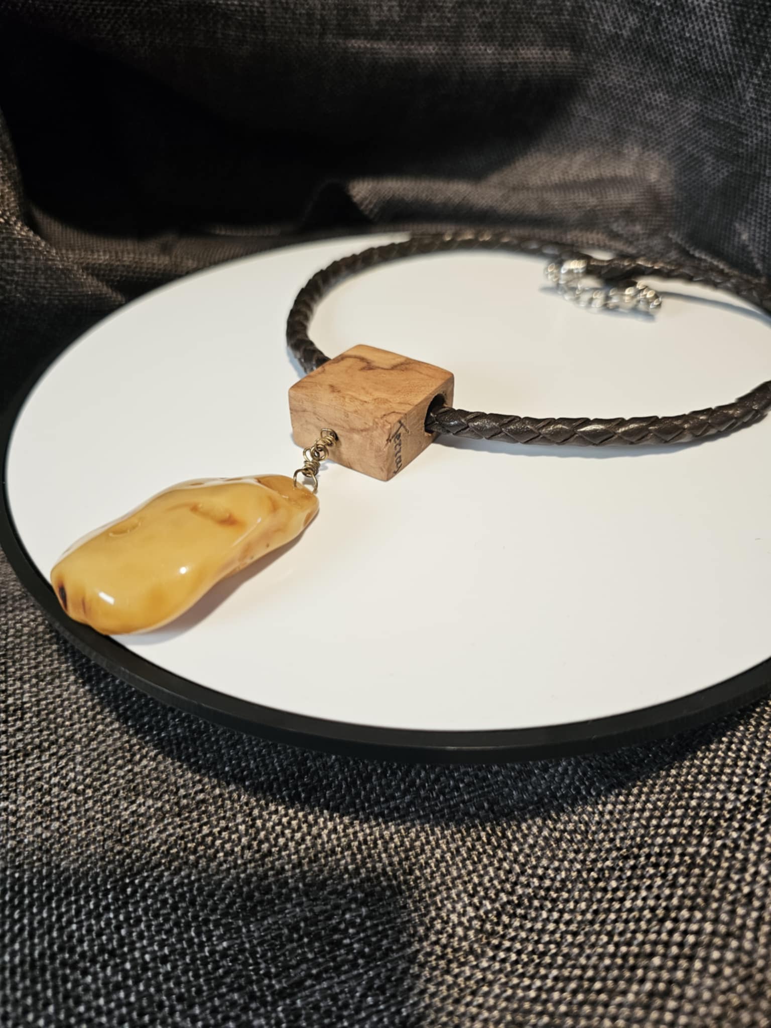COD: TGU0002- Collana – Legno di Ulivo, Ambra, Cuoio e Argento 925